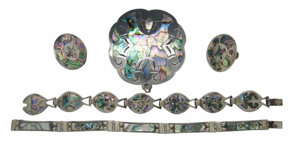 Pendant/Brooch – 2.25” - 16.4g / Earrings – 1” - 4.3g / Bracelet 1 – 7” x 0.5” - 9.6g / Bracelet 2 – 6.75” x 0.5” - 11.1g (Diameter/Length x Width/Weight)