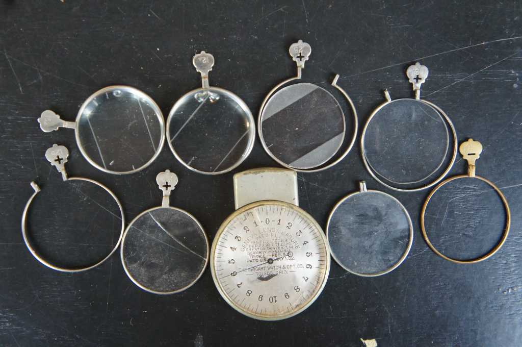 American Optical Company Wellsworth Products Optometrist Exam Case. Contents: Wood Case w/ Keys; 2 Eye Paddles; 2 Rulers; Four Lens Flipper; Oculus Trial Lens Frame; 204 Total Test Lenses. Missing Lens Sizes (Based on Labeled Slots): Spherical Concave 0.62 (both), 1.25, 3, 4, 6, 12 / Spherical Convex 0.25, 0.75, 1.25 (both), 2, 2.5, 3.5, 4, 4.5, 16 / Cylindrical Concave 0.37, 0.75 (both) / Triangular 3, 8. Extra Lenses: Spherical Concave 9, 13 / Spherical Convex 0.37, 0.5, 1, 11, 13, 14 / Triangular 1, 4, 10.