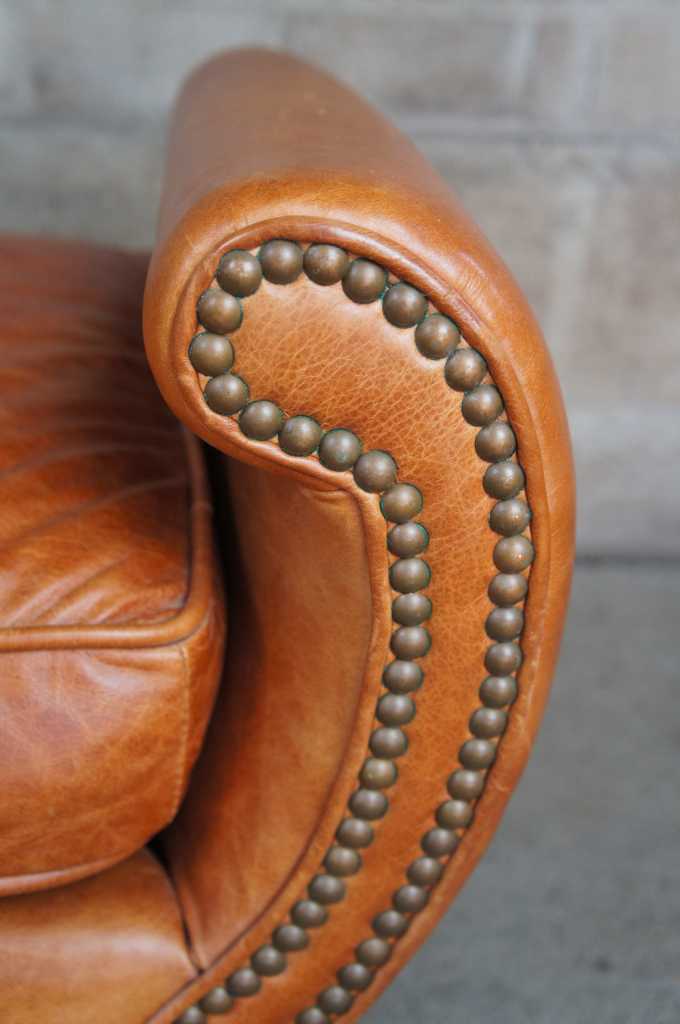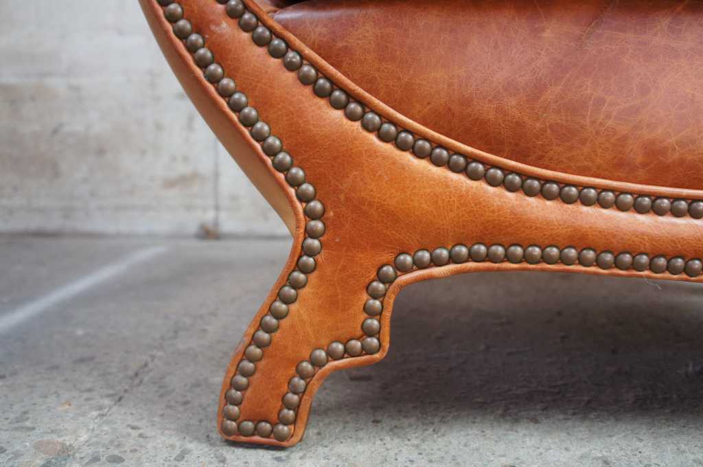 Imperfections are the result of aging, some distressing to the leather, patina to brass nail heads, blemish to seat