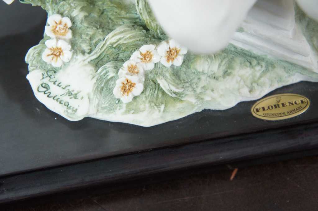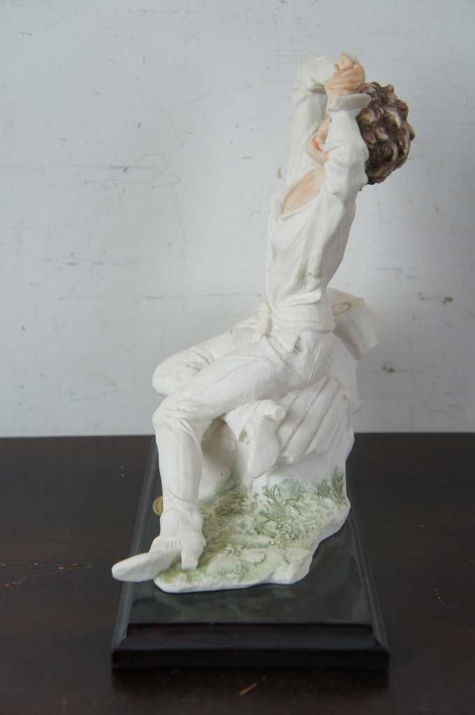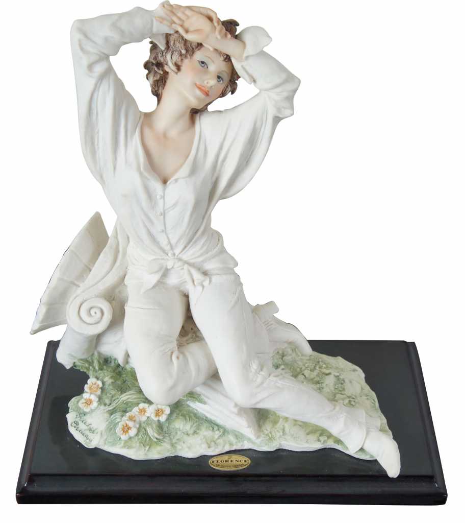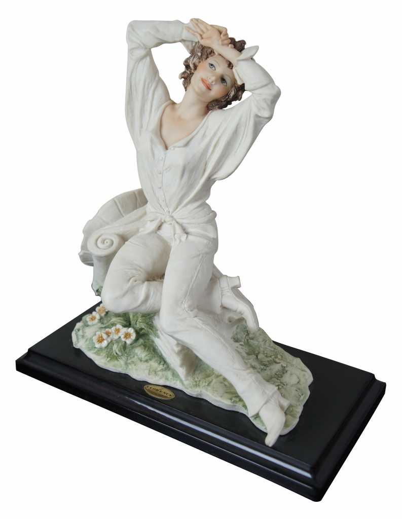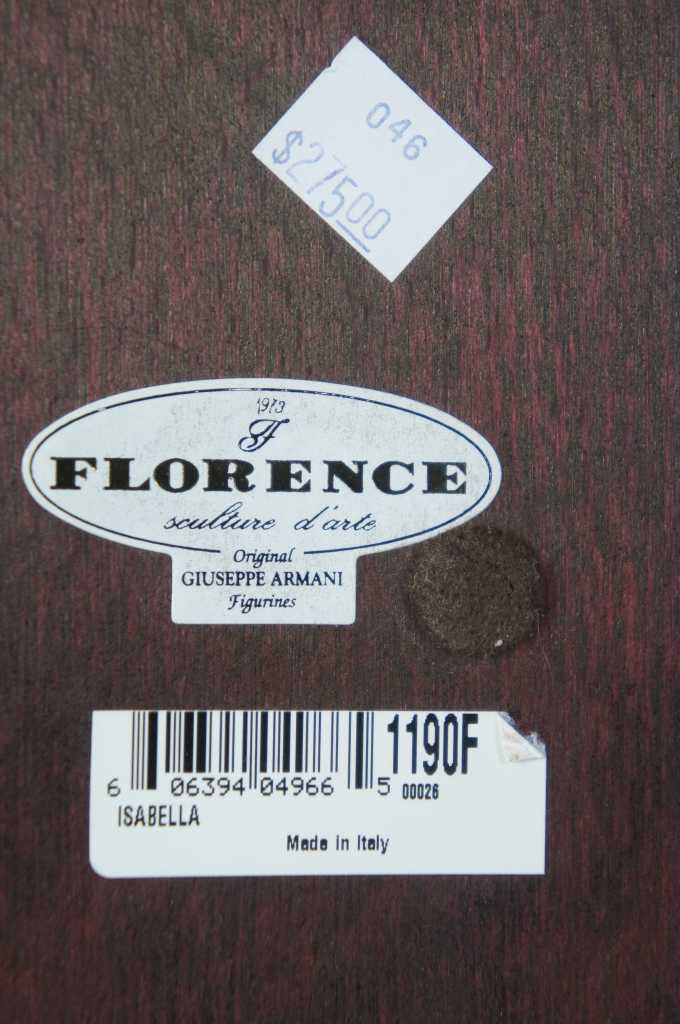 Giuseppe Armani Issabella 1190 F, 1998. Giuseppe Armani was born in Calci, Italy, in 1935. From the moment young 'Bebe' could pick up a pencil, he drew. He drew everything he saw. He drew everyone he knew. He drew all day long. Armani's parents were amazed at Giuseppe's prodigious output and they recognized that their little boy's sketches were more than just the whimsical drawings of most children. Uncanny realism and attention to detail revealed Giuseppe's true talent. He had The Gift. Giuseppe's teachers decided that Armani should attend the Academy of Fine Arts in Florence. Unfortunately, as the arrangements were being made, his father died unexpectedly. The family needed Giuseppe now. Art school was forgotten. But the Art was not. Giuseppe Armani's natural talent was finally recognized when a local priest organized an exhibition of young artists; Giuseppe entered a sculpture of a classically inspired male torso. The work was greatly admired for its extraordinary anatomical precision. When the torso was taken to the Art Gallery in Pisa -- located across the street from the famous Leaning Tower -- Giuseppe Armani's talent was rewarded with the offer of a permanent job there. In Pisa, Armani's dream of studying art was finally realized. He immersed himself in the great masterpieces of the Renaissance that he had only read about in books. He travelled to Siena and Florence and began to hone his personal style; Giuseppe drew heavily on the style of 16th Century Florentine Renaissance. Sculpture, Armani realized, allowed him to work in three dimensions. He infused life, character and even soul into his works. Giuseppe experimented in wood, clay, alabaster and marble and his reputation grew with each breathtaking creation. Art admirers soon started flocking to the gallery to see Armani's latest efforts. In 1975, the Florence Sculture d'Arte, recognizing Armani's genius, offered him the opportunity to work exclusively for them. He would be encouraged to give free rein to his artistic muse. Giuseppe Armani accepted. For more than 20 years Armani has created masterpieces ranging from traditional Capodimonte style to more daring, contemporary, sometimes whimsical sculptures. Always, Giuseppe infused his figurines with breathtaking realism -- with a spark of life. This continues to amaze even his many admirers the world over. Giuseppe Armani describes his credo this way: "Although I consider myself a direct descendant of the Renaissance heritage, I believe that an artist has to follow his own evolution and not solely be a ruminant of the past, as glorious as it may have been. An artist conducts a search that may lead him far out in exploring new areas of interest. I continually search to discover new and better means of expression.