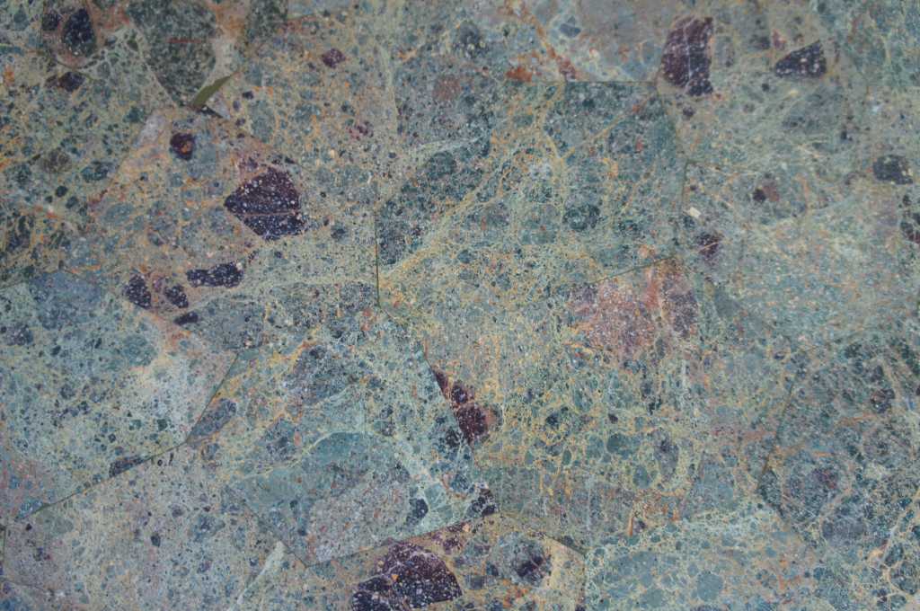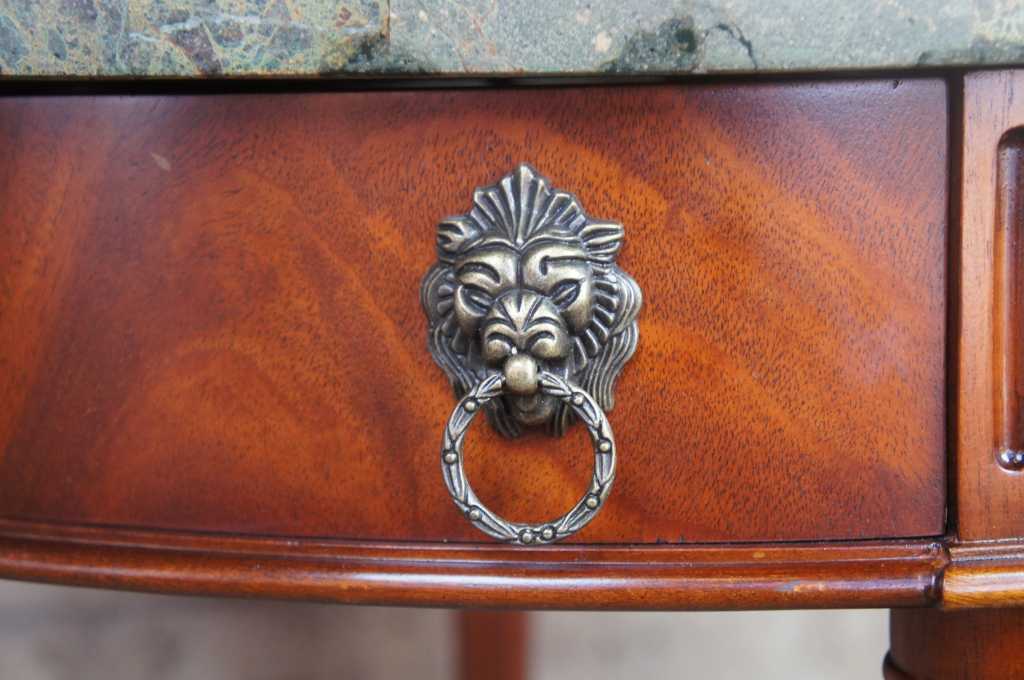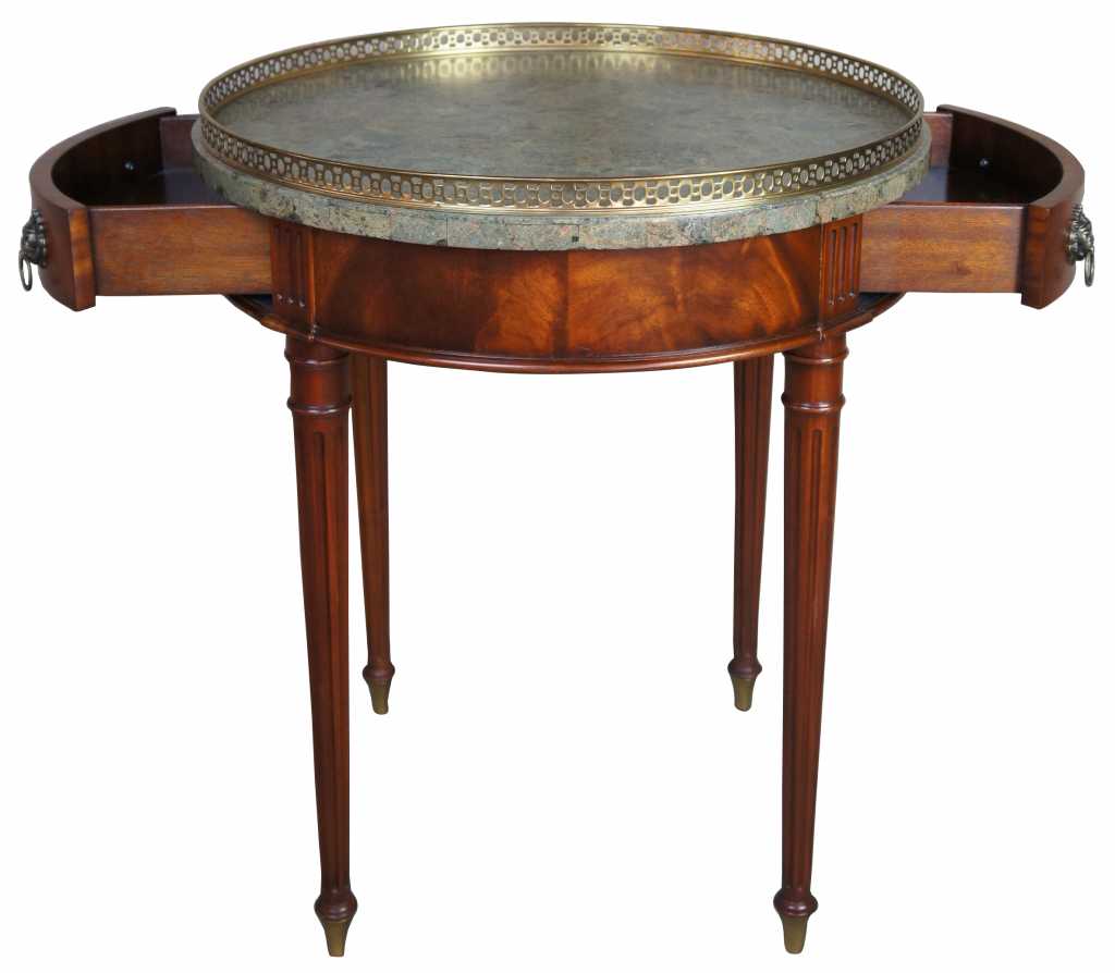 Maitland Smith Bouillotte table. Bouillotte was a card game similar to poker in the 18th century. The circular tessilated stone top features varying shades of green surrounded by a pierced brass gallery. Features a crotch mahogany base with two drawers and figural lion head pulls. Legs are fluted and tapered to an arrow foot with brass caps.
