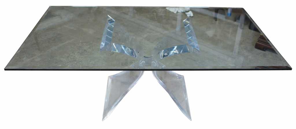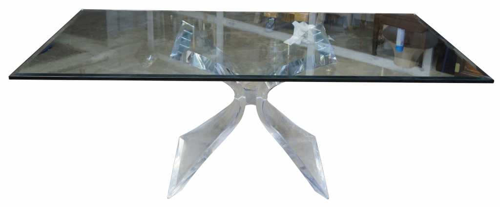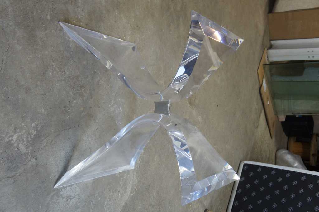 Lion in Frost signed lucite butterfly table. Features a thick beveled glass top over sculptural base connected by chrome center. A nice touch for any modern space.