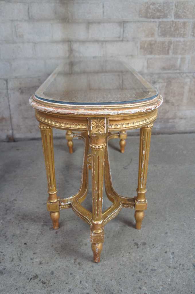 This beautiful antqiue louis XV table was originally made to be a bench. Features a cained top, carved apron, tapered and fluted legs leading to arrow foot. Table features a polished glass top allowing it to be used as an accent piece or coffee table.