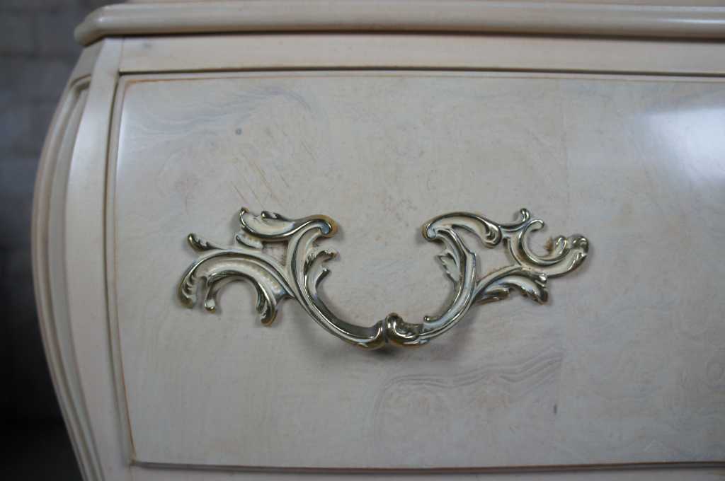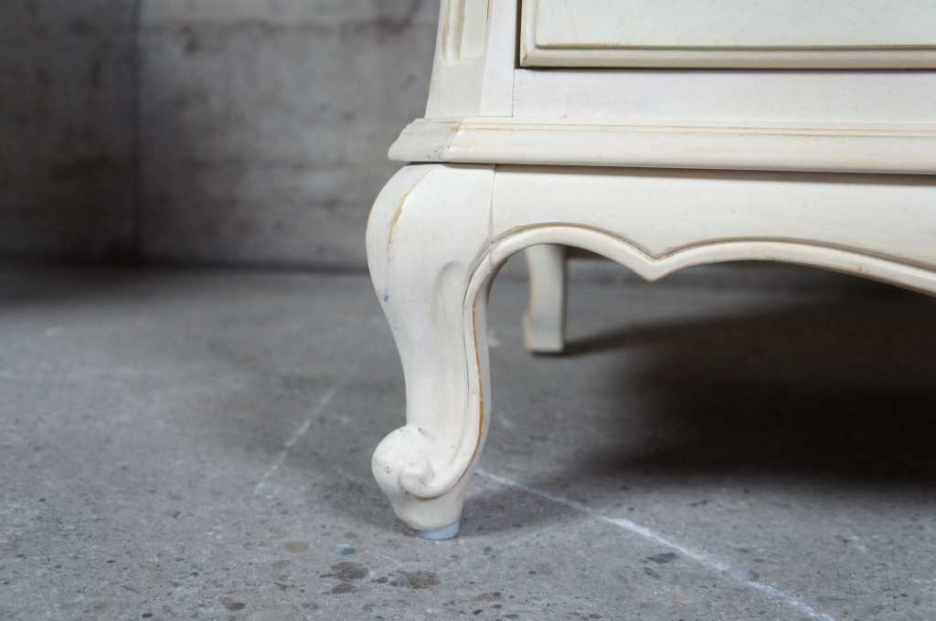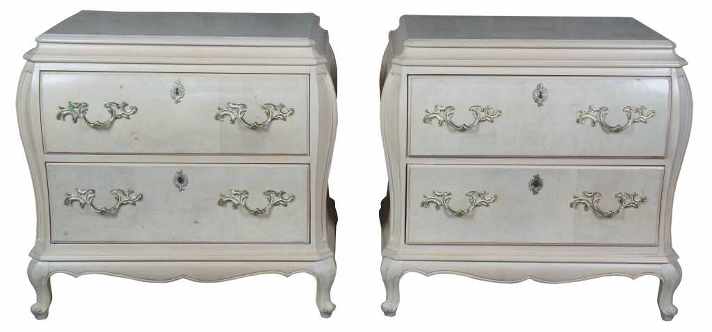 Henredon bombe nightstands. Feature a whitewashed finish with serpentine base and cabriole legs.