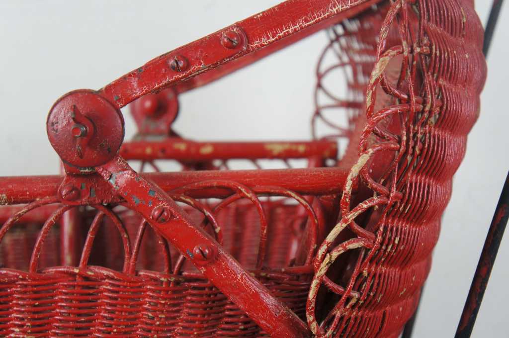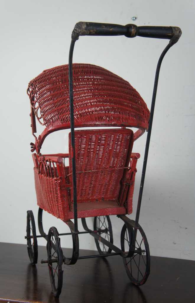 An exquisite Victorian era stroller with convertible canopy. Made from wicker with red painted finish and black metal base. An eye popper in any setting.