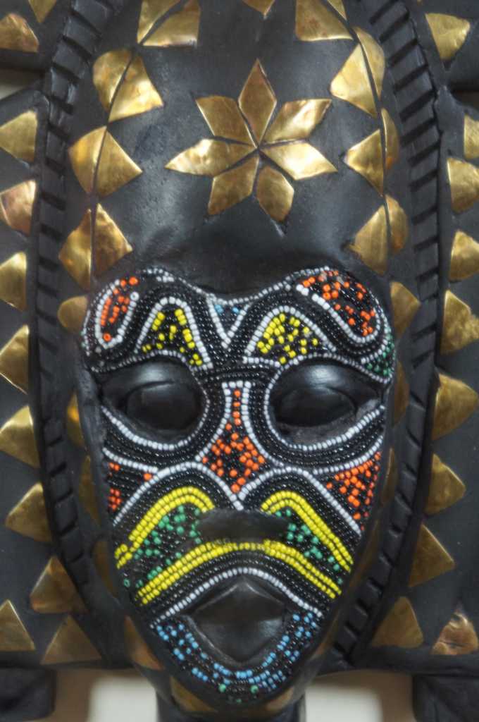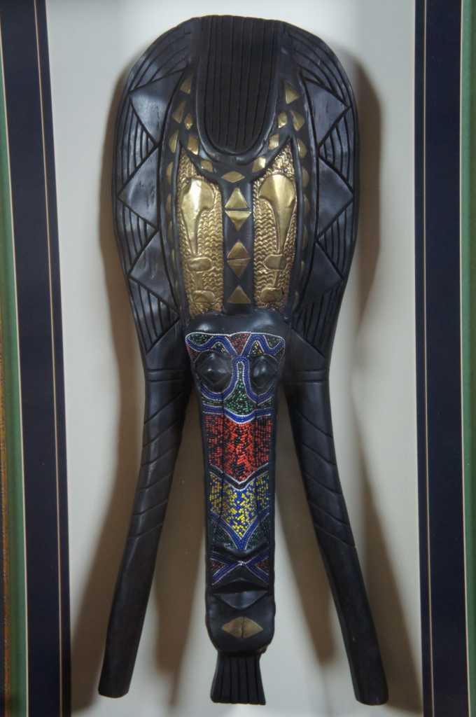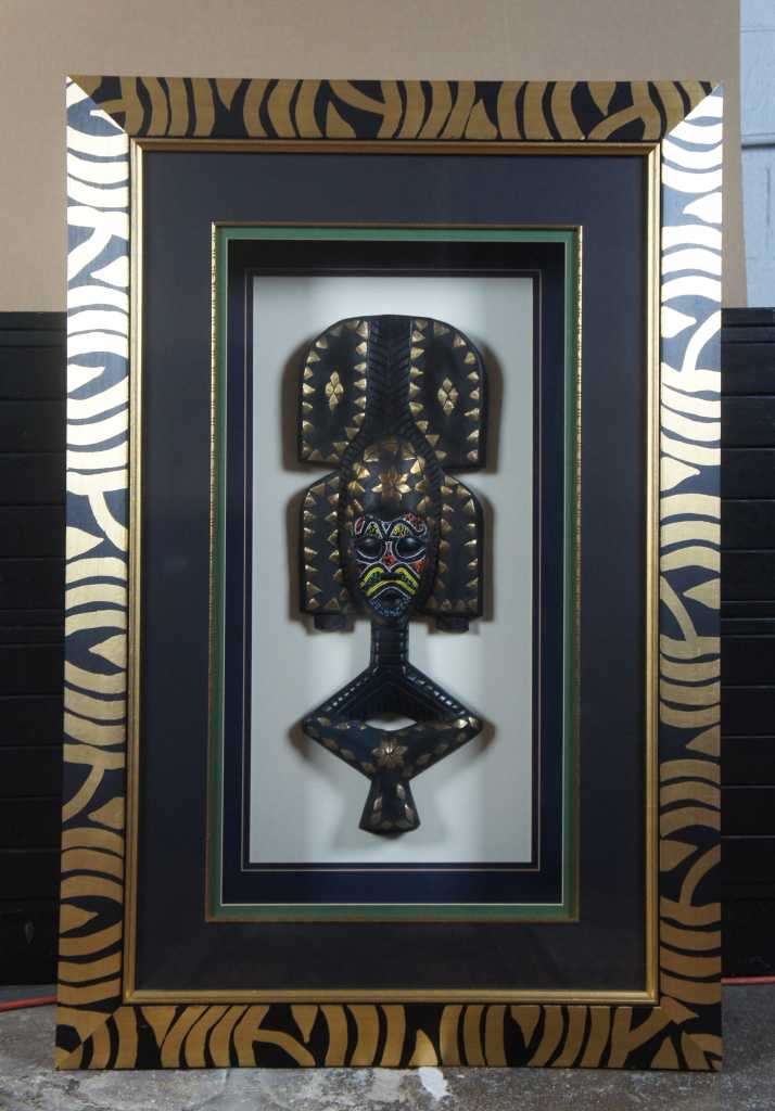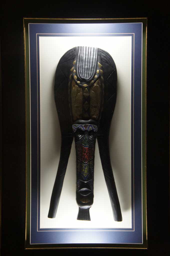 A unique pair of African carved masks with beaded and painted accents. Each is mounted behind glass in an illuminated frame with gold painted edges.