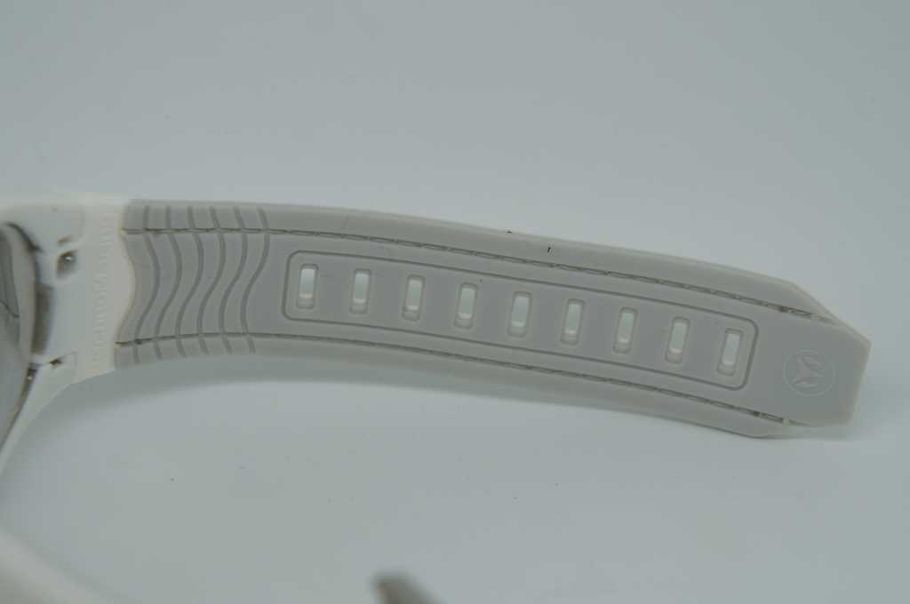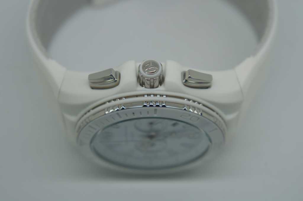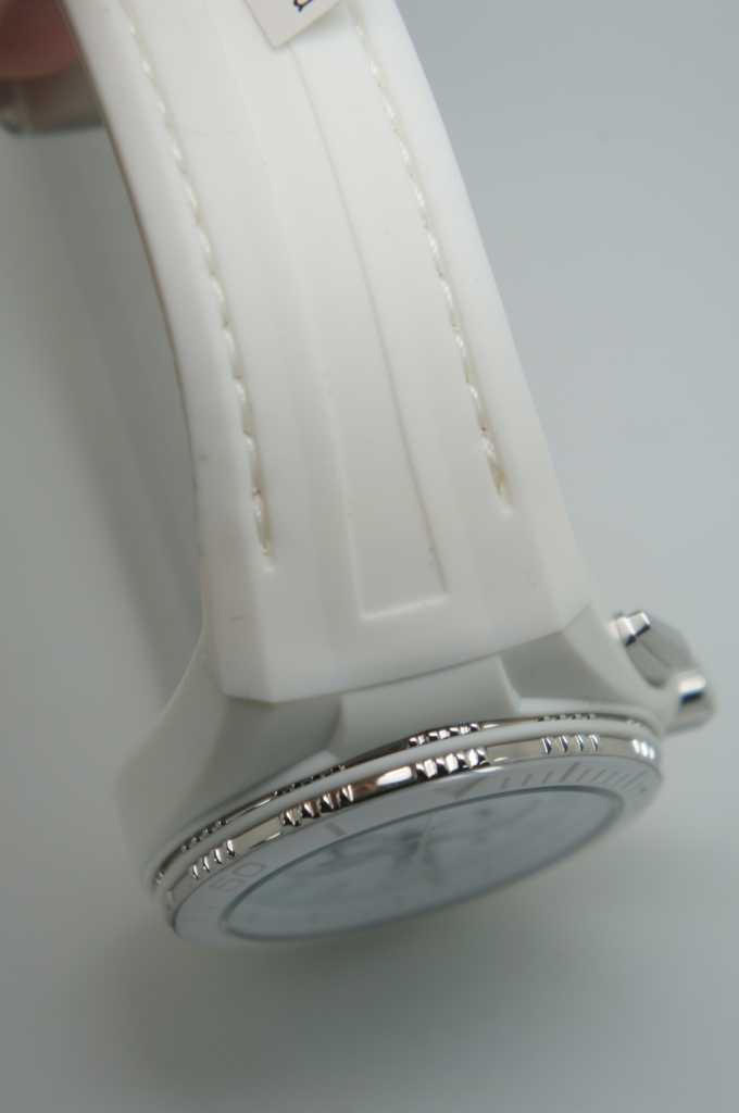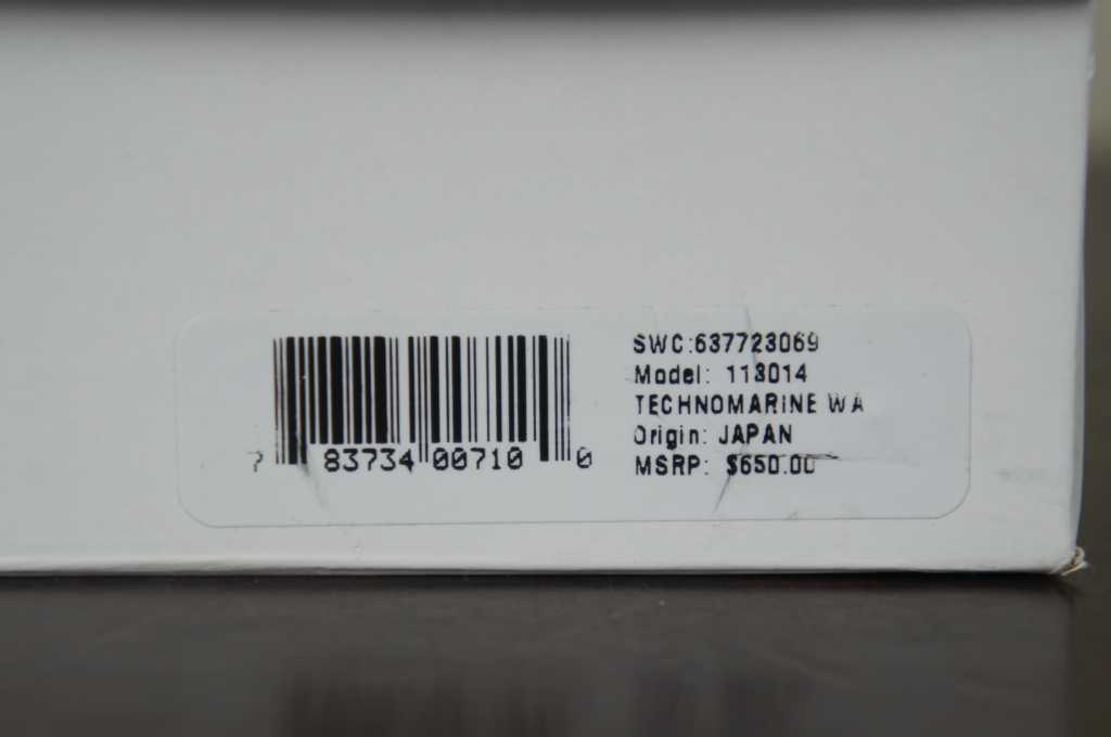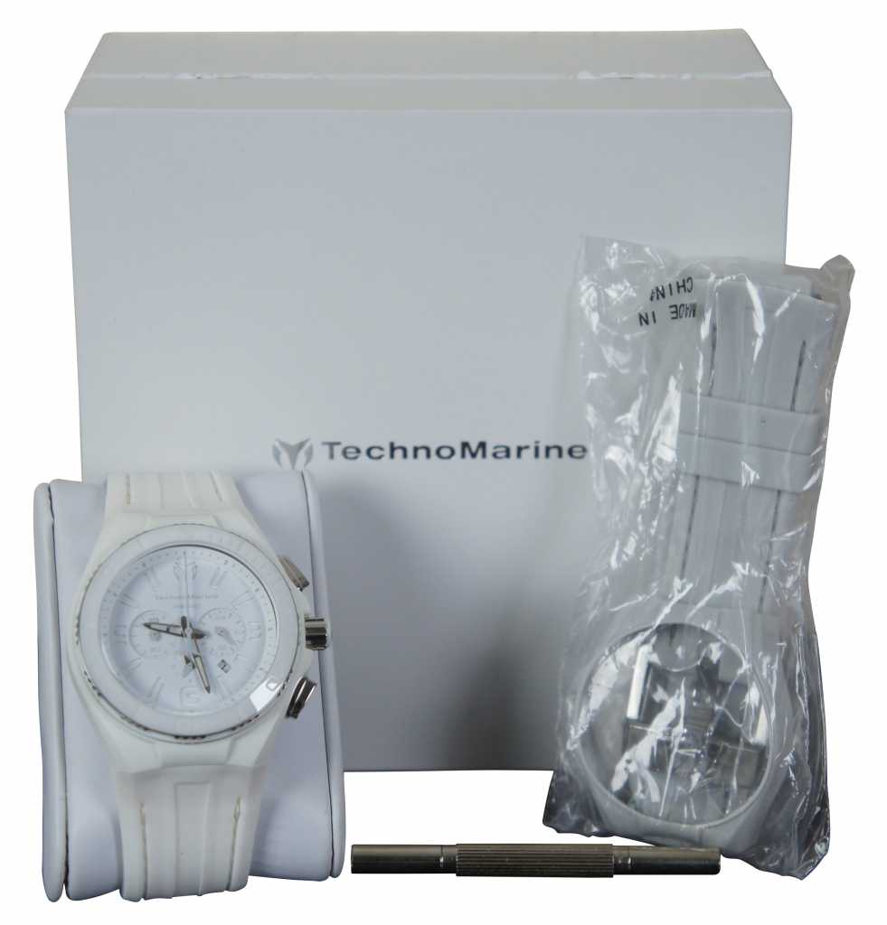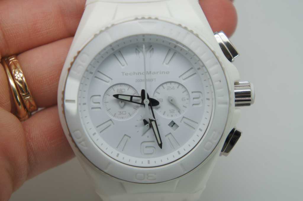 Stainless steel case with white rubber covering with a white rubber strap. Uni-directional rotating bezel. White dial with silver-tone hands and index and Arabic numeral hour markers. Minute markers around the outer rim. Dial Type: Analog. Luminescent hands. Date display between 4 and 5 o'clock position. Chronograph - three sub-dials displaying: 60 second, 60 minute and 24 hour. Quartz movement. Scratch resistant Mineral crystal. Screw down and Push Button crown. Solid case back. Case diameter: 45 mm. Case thickness: 14 mm. Round case shape. Band width: 17 mm. Tang clasp. Water resistant at 200 meters / 660 feet. Functions: date, hour, minute, second, chronograph. Sport watch style. Watch label: Japan Movt. Technomarine Cruise Vision II White Dial White Rubber Unisex Watch 113014.