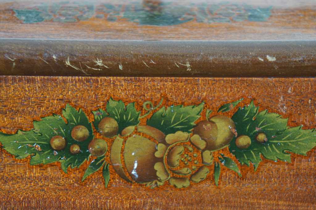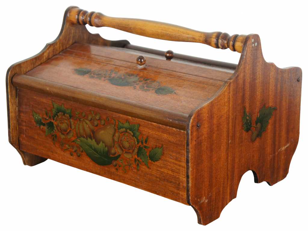 20th century mahogany sewing box. Features a handle for ease of movement, double lid and bobbin shelf. The exterior features a fruit and nut design.