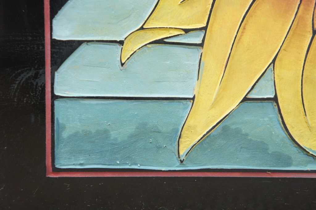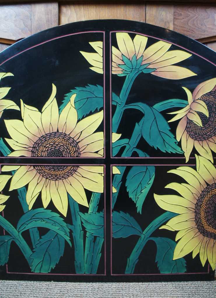 Very Good – Some cracking to lacquer on top; couple small marks on sunflowers; one hinge missing rod; see pictures