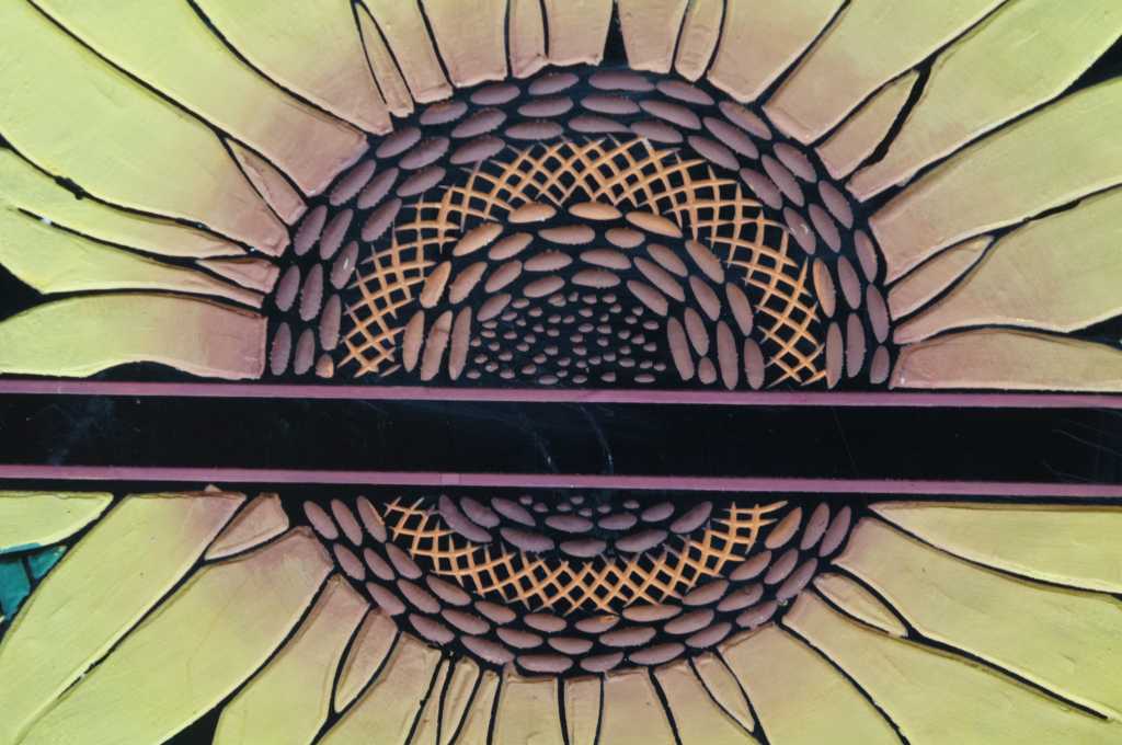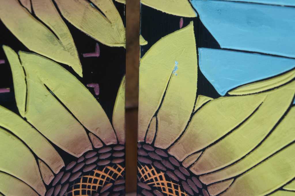 Vibrant divider screen or wall panel, features sunflowers and double hinges.