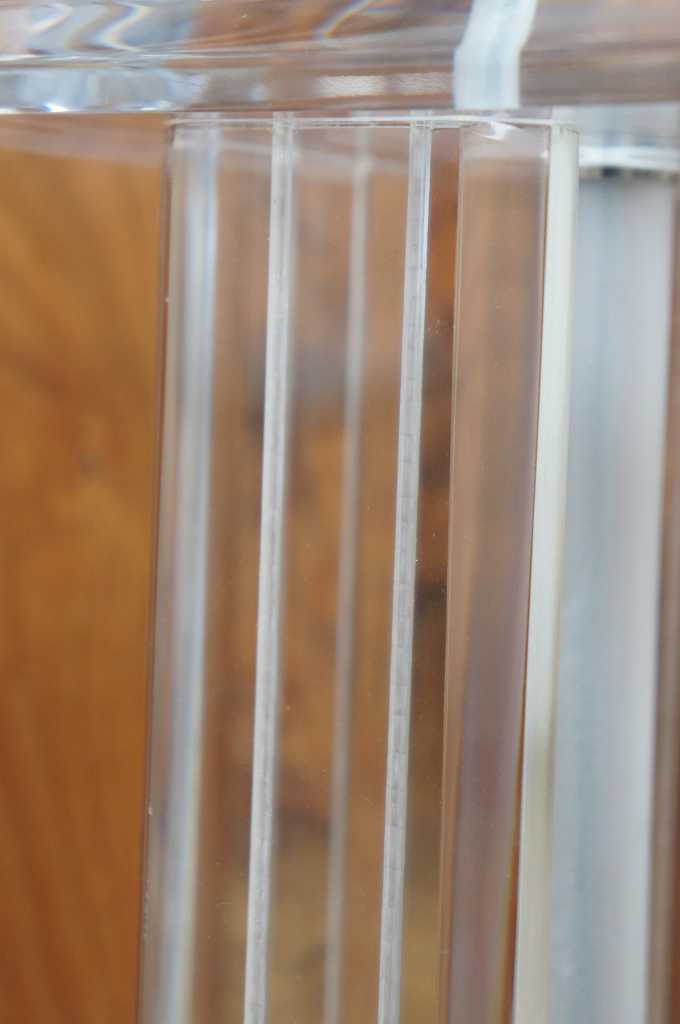 Lucite table lamp featuring four columns between square surfaces with beveled edges.