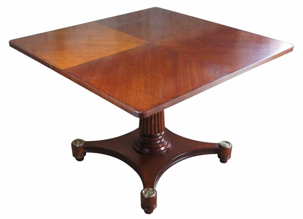 Traditional style pedestal table by lexington furniture. 554-873. Great dining or breakfast table, features a square top with matchbook veneer and rounded edges and fluted edges. Table supported by a grooved column mounted to footed legs with brass castors coming from the pedestal.