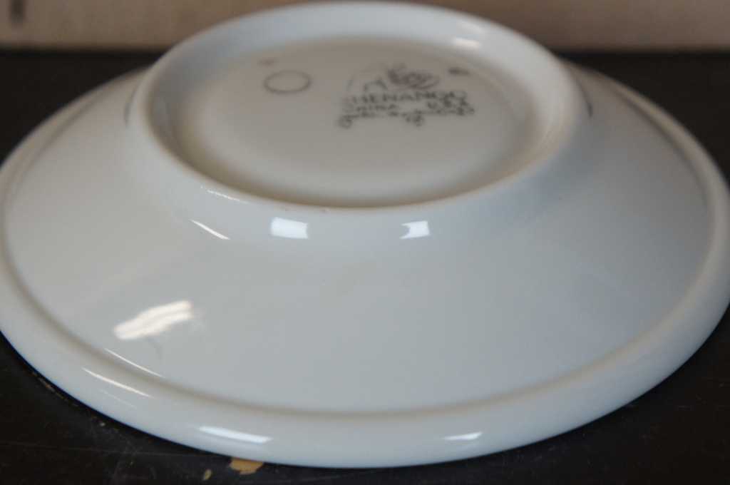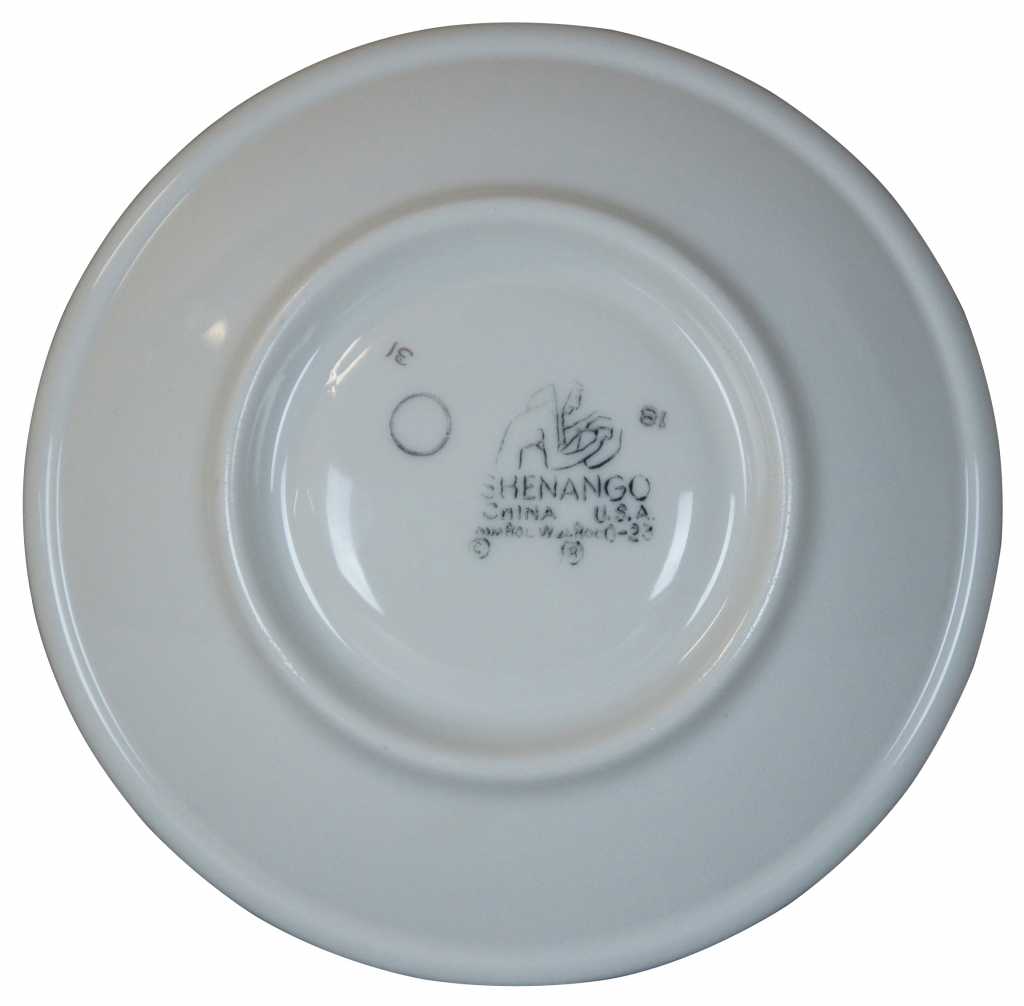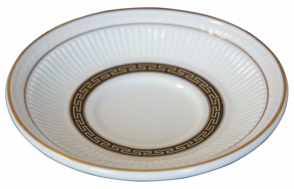 Shenango Dinnerware Saucer. Quantity 305, sold separately. Greek Key design. Ivory color with black and gold trim. This set came from the Oakwood Club, a fine dining restaurant in Dayton, Ohio. They opened in 1962, and this was their original set before going into storage.