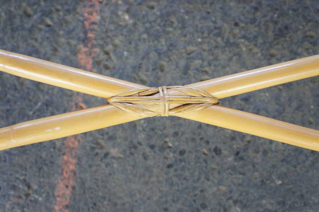 Circa 1970s bamboo and rattan console or hall table. Features a rectangular form with x shaped stretcher. Reminiscent of Mcguire and Ficks Reed craftsmanship.