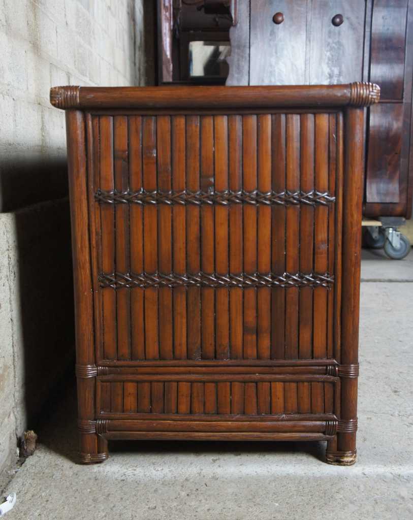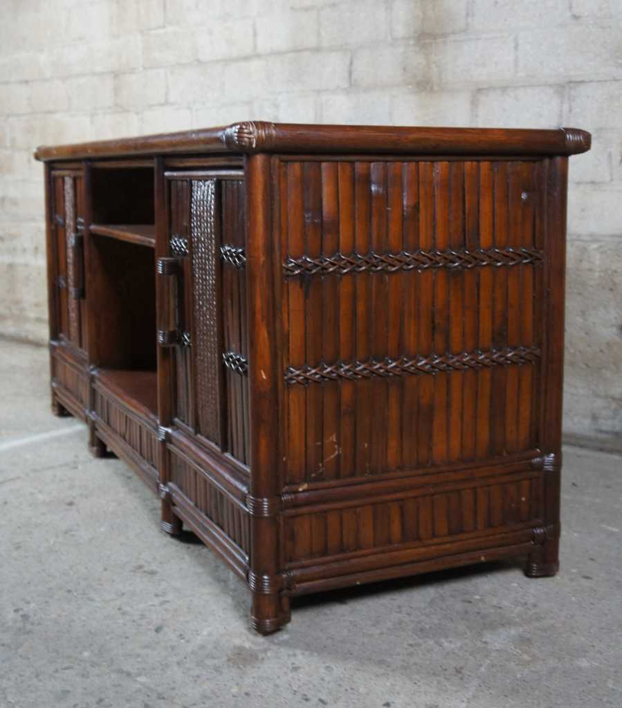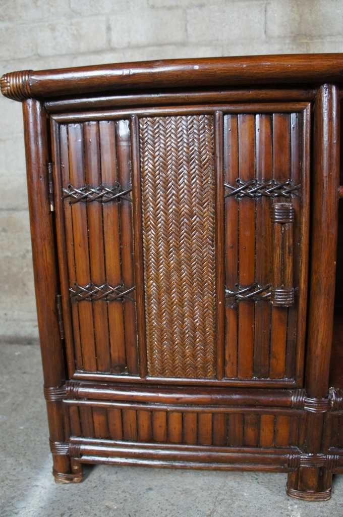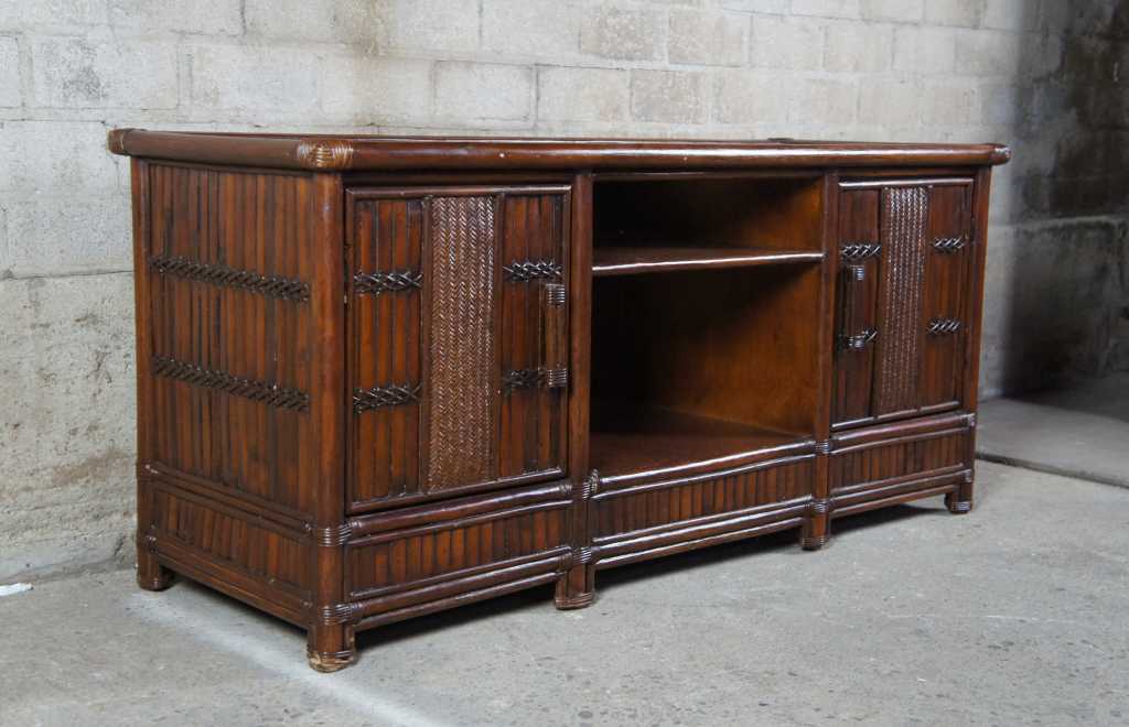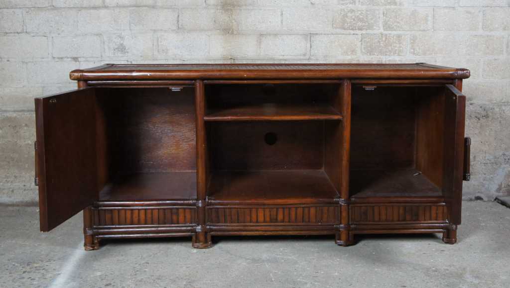 This TV stand features faux bamboo design with open center and outer cabinets. Cabinet and doors feature rattan and reeded design. Holes along back for electronics. Finished in a medium brown. Great TV cabinet or record table.