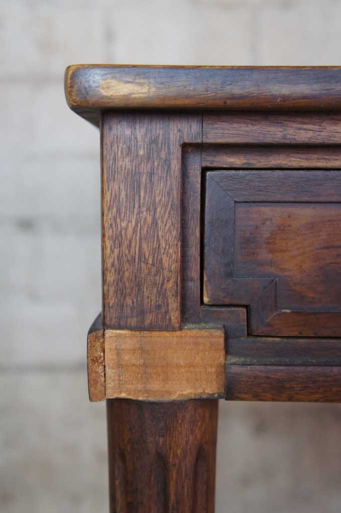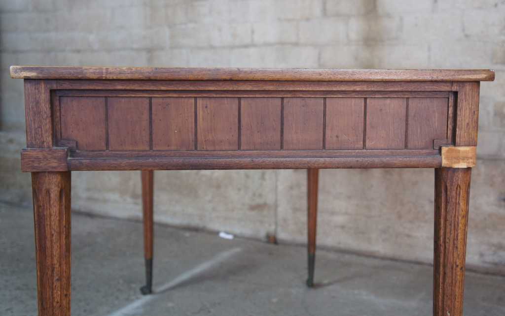 Vintage Desk; features a petit leather top mahogany writing desk. Two drawers, long thin tapered and fluted legs, castors. Original leather top has been painted and distressed.