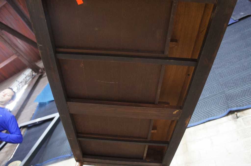 Very Good – original leather has been painted, missing molding on corners, distressing, patinia on legs and handles; see pictures
