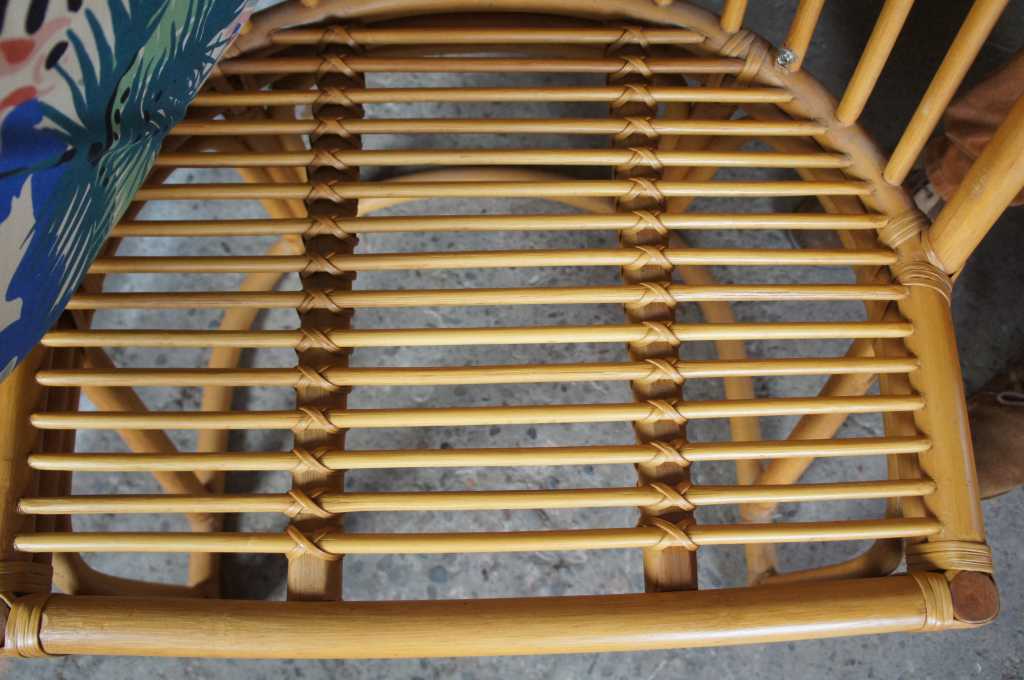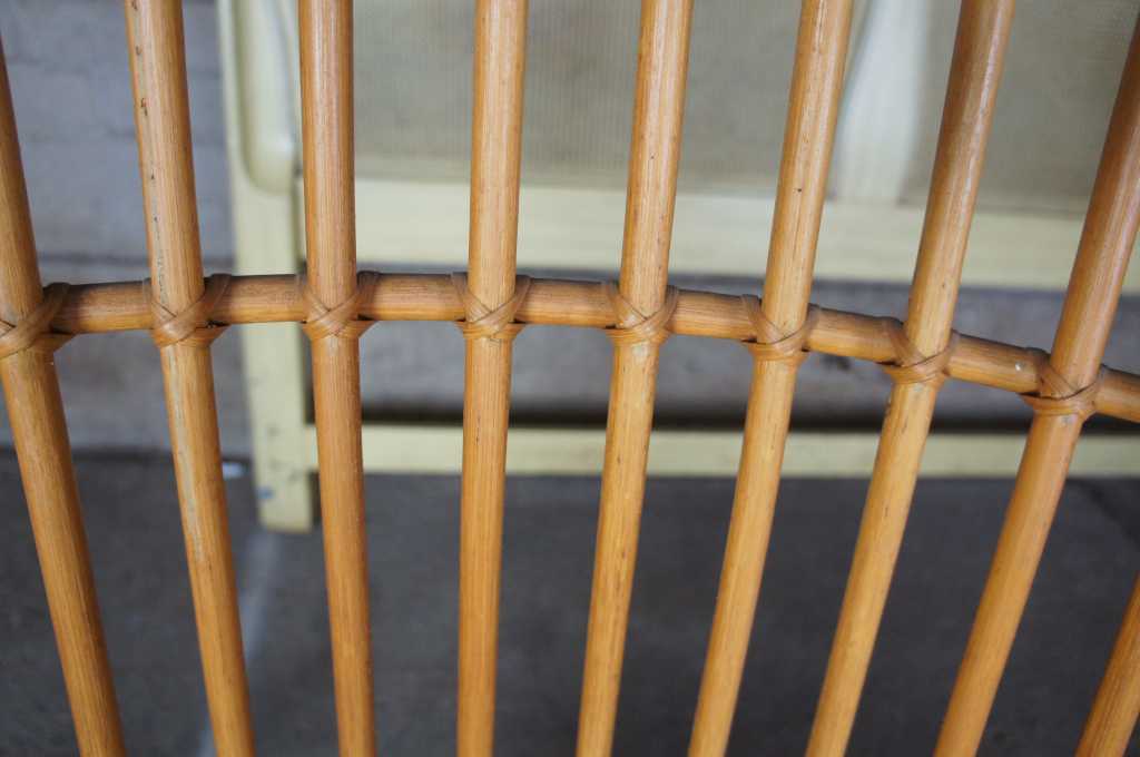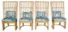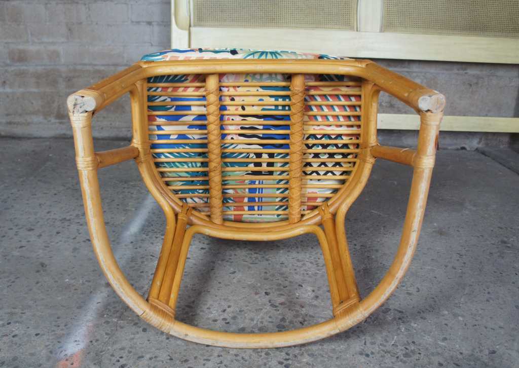 Amazing set of four bamboo boho chic chairs. Feature a wrap around bentwood back with rattan accents. Upholstered with lower back cushion.