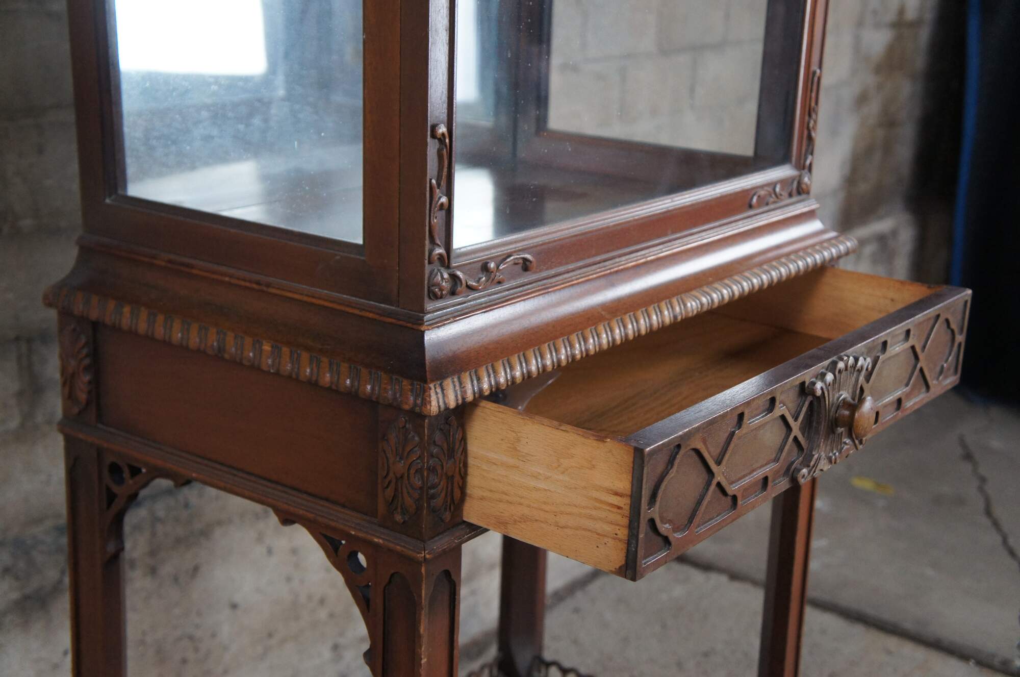 Antique Chinese Chippendale display curio or vitrine cabinet, circa 1940s. Pagoda form top, carved door opening to interior with two adjustable height glass shelves, glass sides and a mirrored back. Single drawer below with blind fretwork front, shelf below with wood gallery. Standing on carved feet.