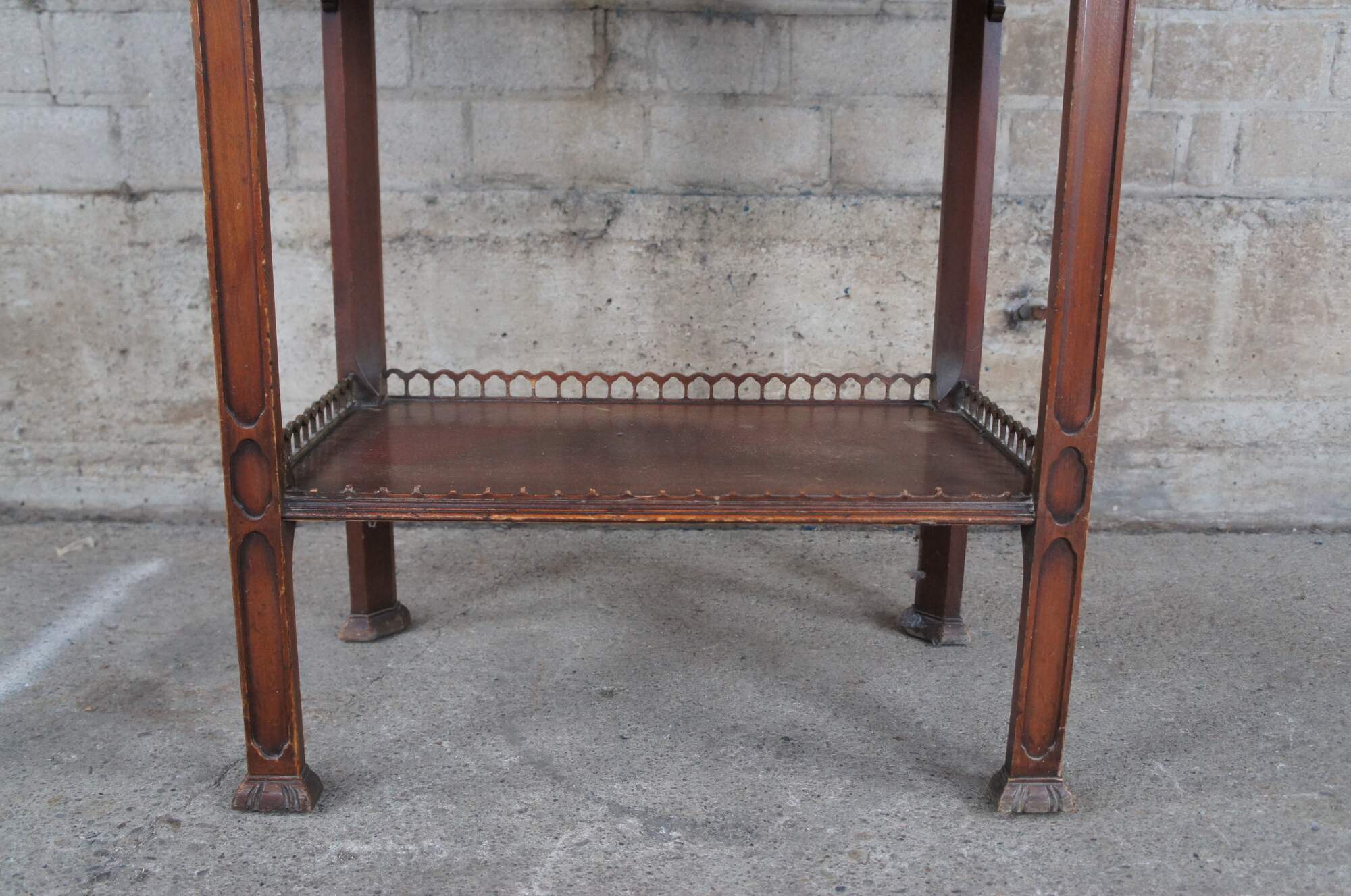 Good Overall with trim loss and staining to shelves. Most of the missing pieces have been retained and could be repaired. Missing trim along front of lower shelf and back left side of top. Spandrel along lower left side of drawer unattached.