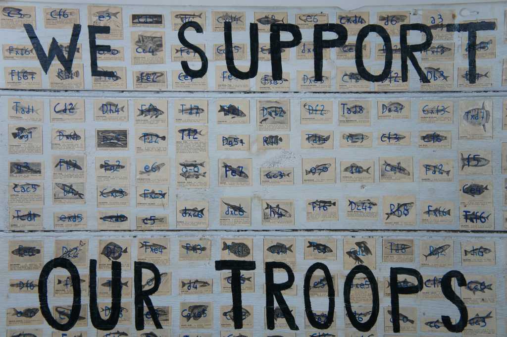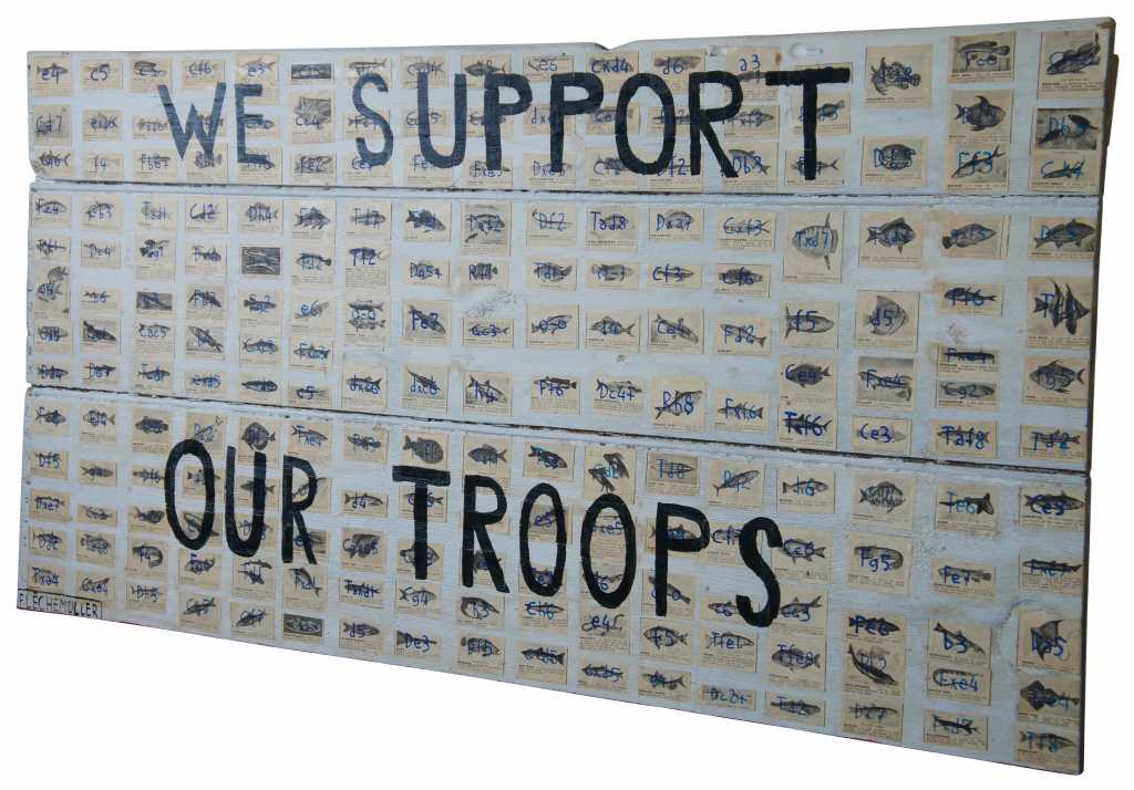 We Support Our Troops Decoupage by Jacques Fleshemuller. Jacques Flechemuller (Born 1945) moved to Paris, with his family, early in life. It was here he first became aware of art through the monthly calendars that were given out by the local post office. Everyone had calendars with images of kittens, puppies and happy family settings hanging in their kitchen. He looked forward to each new month and its accompanying image with blissful anticipation. This was the foundation for his awareness in the power of art to elicit pure joy. When it was made evident to him that these images, in fact, were not art, he was devastated. Humor came to be a very important factor in his work.
