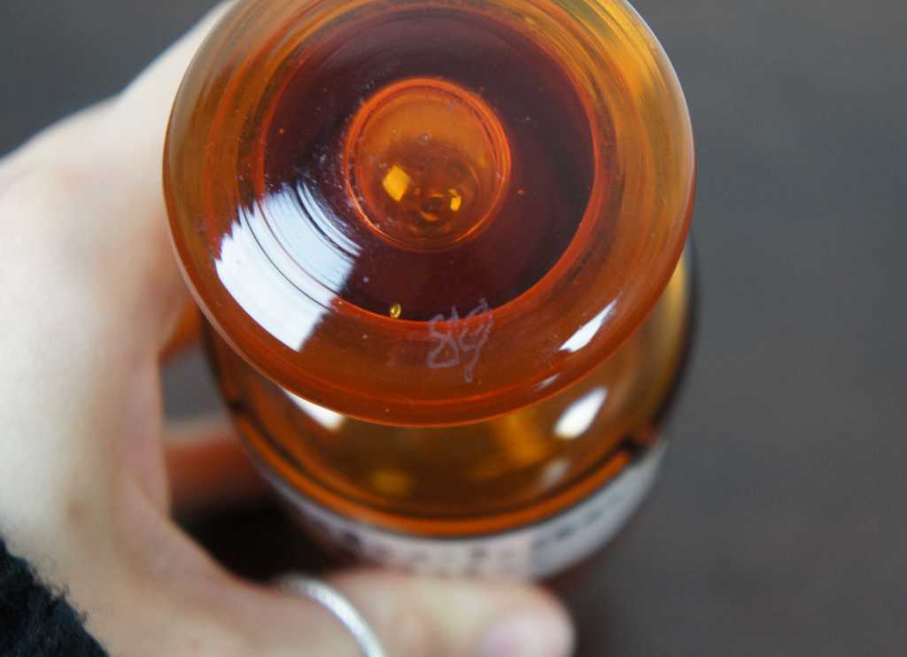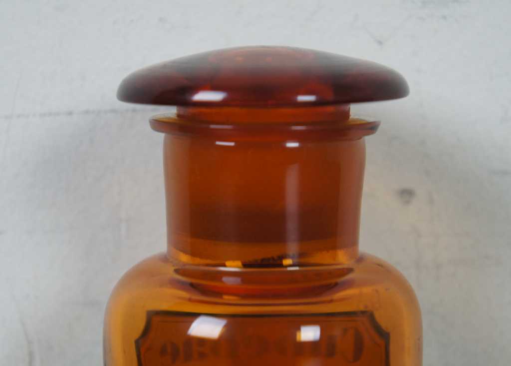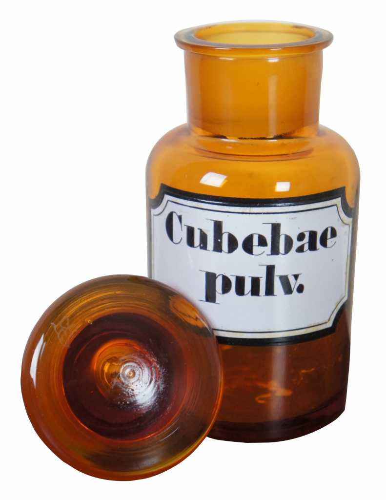 Cubebae Pulv. Medicine Bottle, features glass on glass stopper, and some etching on the lid and bottle.