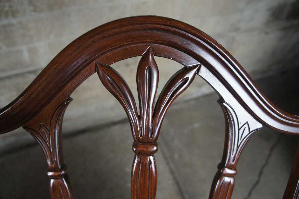 Gorgeous pair of antique shield back dining or accent chairs. Made from mahogany with carved back and tapered legs leading to spade foot. Upholstered in southwestern fabric with medallion center.