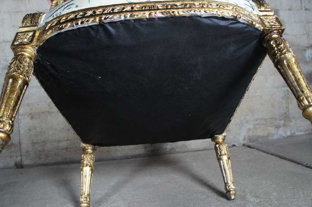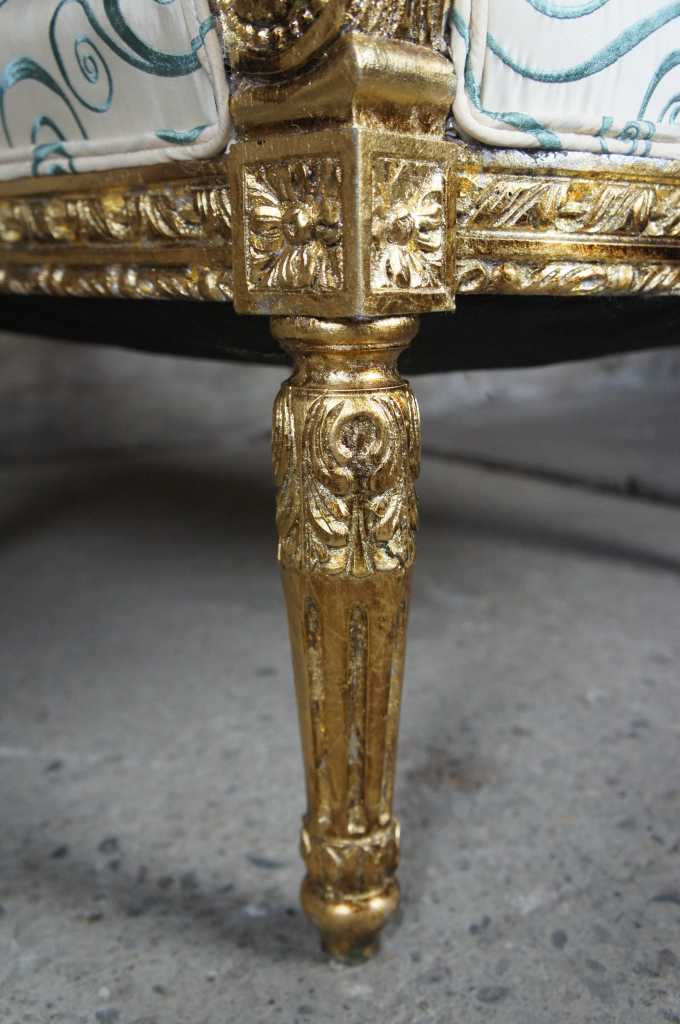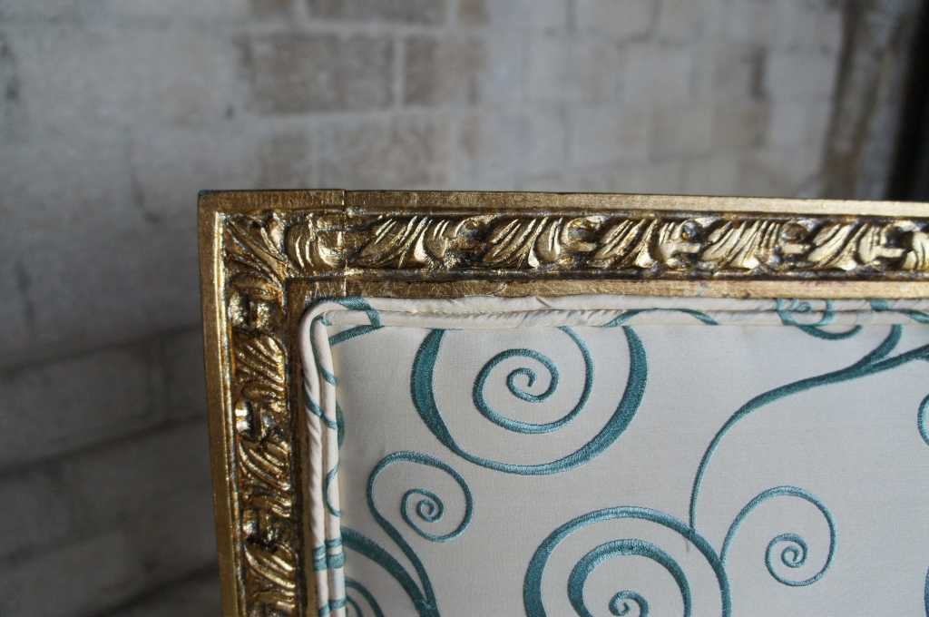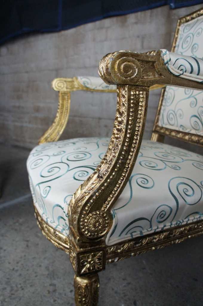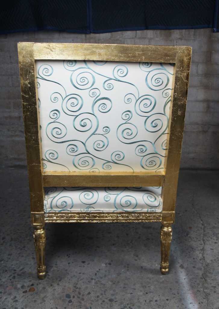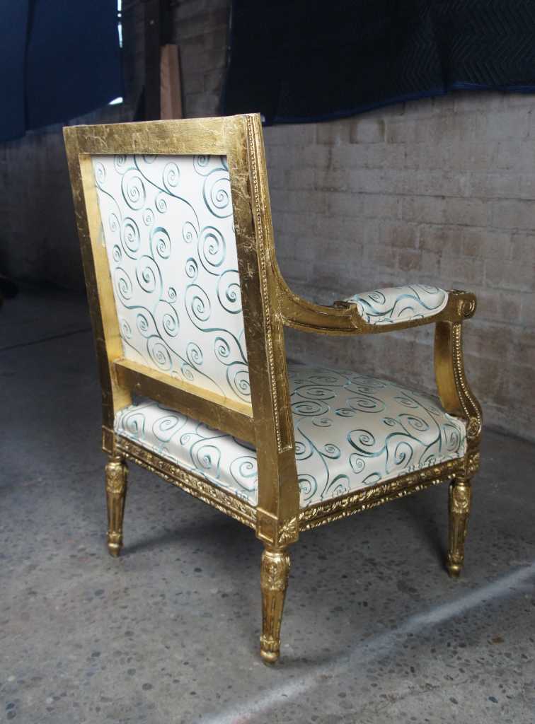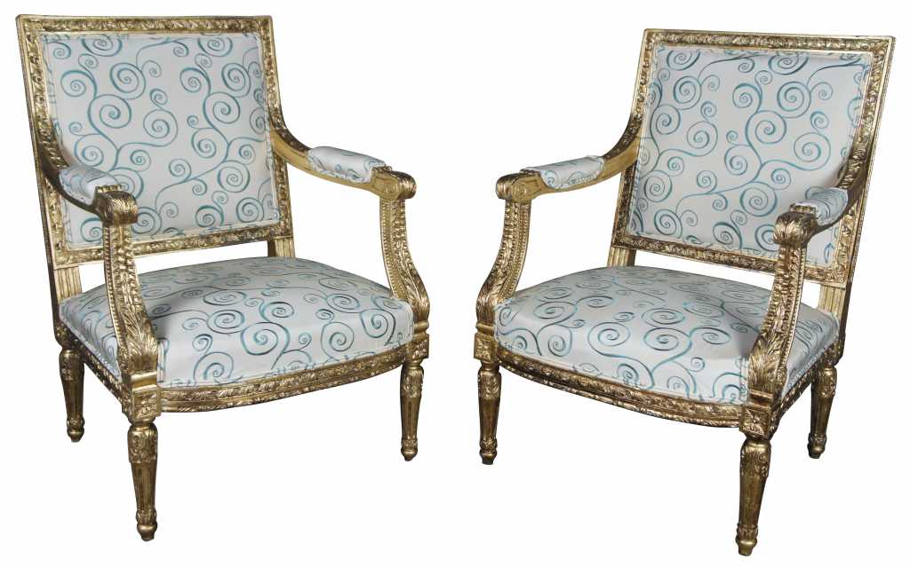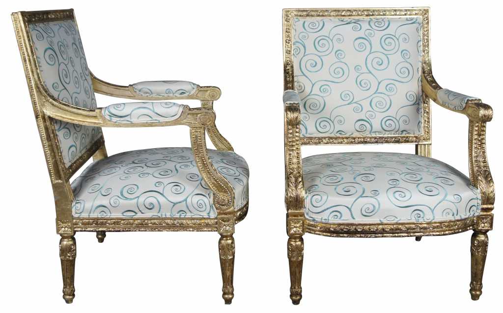 Late 19th century Louis XVI fauteuils. An ornate pair with modern upholstery, trimmed in gold with acanthus detail and traditional accents. A great pair of armchairs for any setting.