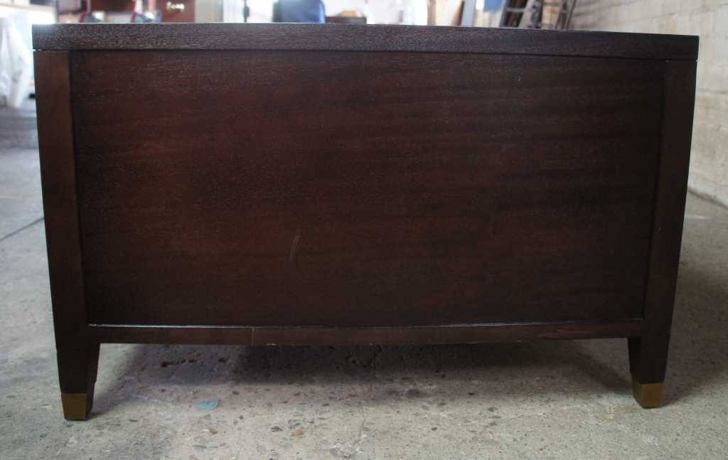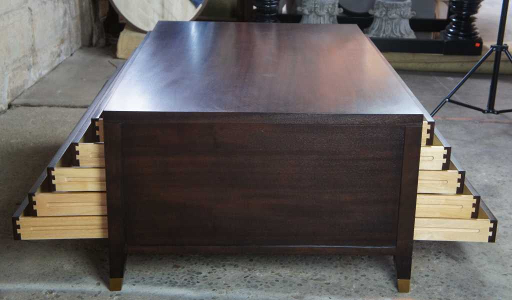 Bellemeade Signaure Blake map coffee table. Made from mahogany with five drawers on each side. Each drawer is dovetailed and includes two brass pulls. Legs are tapered with brass caps. The perfect complement to any traditional or modern space.