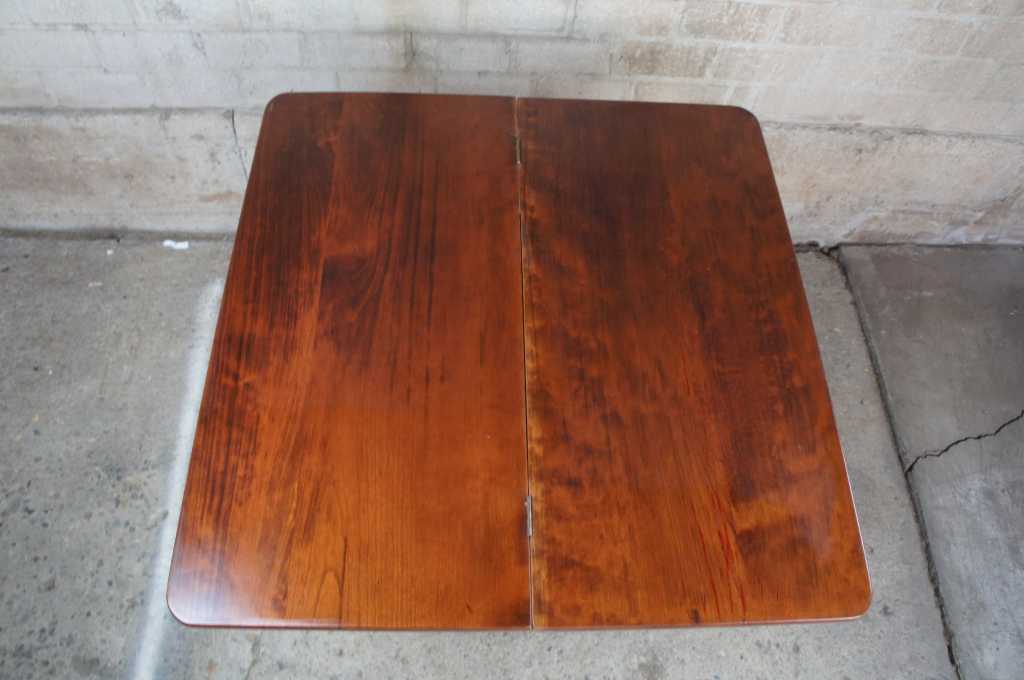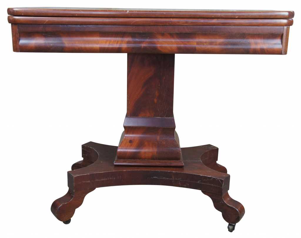 Exceptional flame mahogany game table, circa 1850s. Features a solid mahogany swivel flip top with compartments beneith for storage.