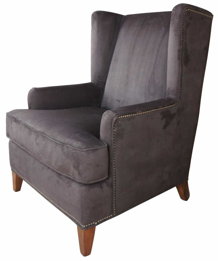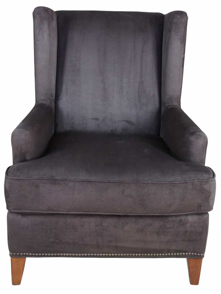 Brown velvet uphosltered wingback chair attributed to Safavieh. Great vintage chair, very comfy.