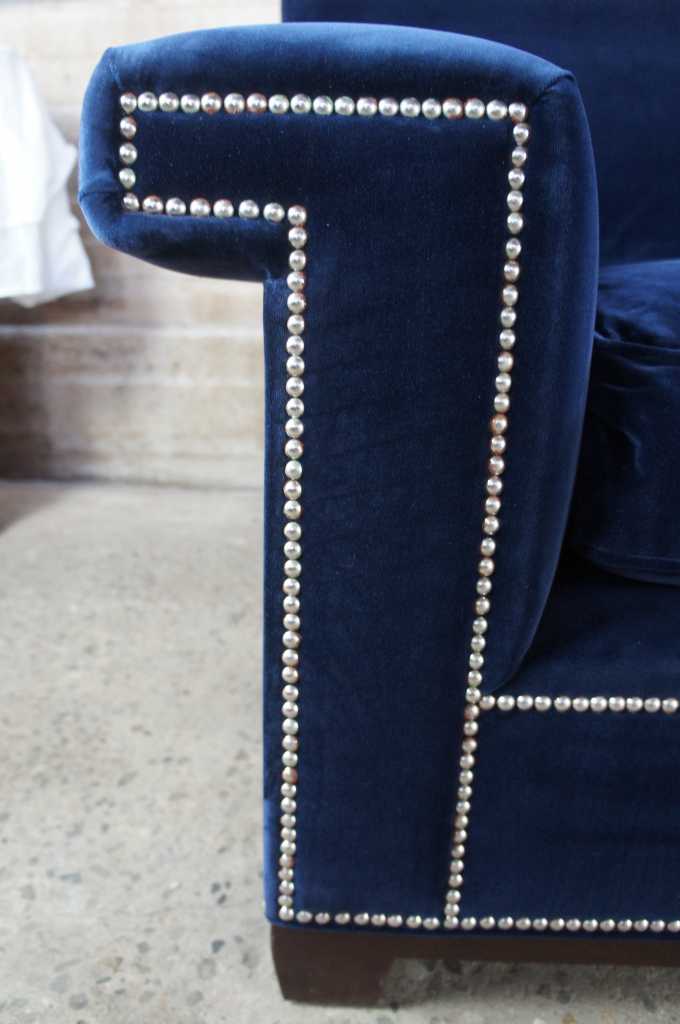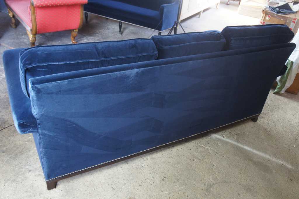 Barclay Buteras Paxton sofa; upholstered in a blue velvet with silver nailhead trim over a bracketed base.