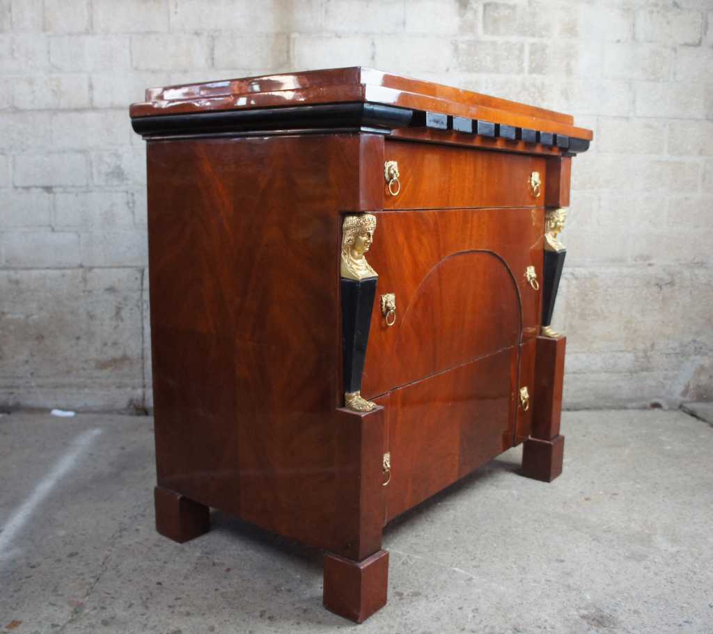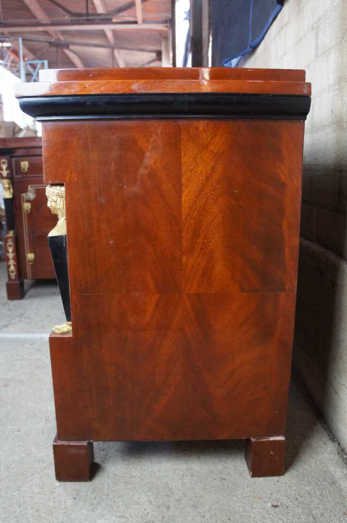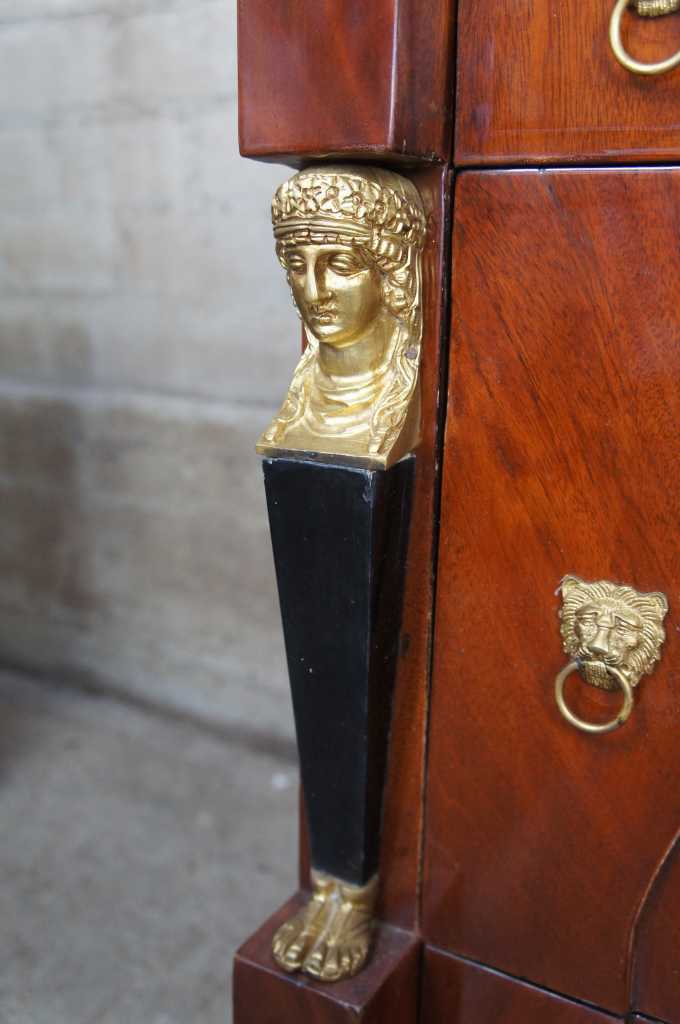 20th century Egyptian Revival three drawer chest. Made from mahogany with figural mounts and lion knocker drawer pulls. Features a blend of French and art deco styling. Perfect for use as a bedside table, dresser or stand alone piece. Matching table available with handpainted detail.