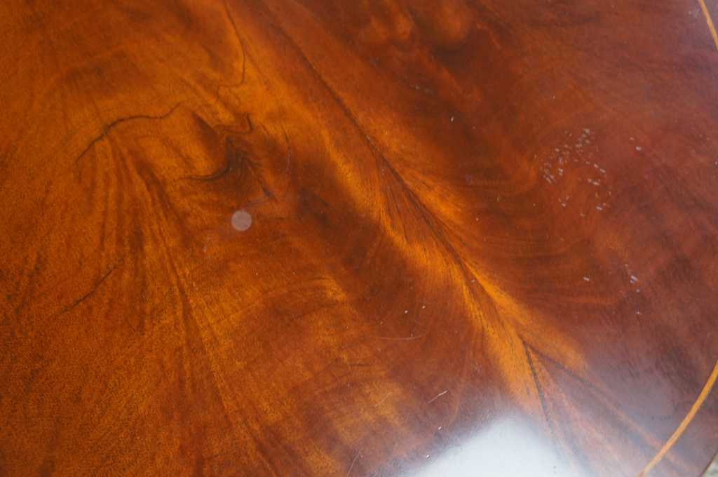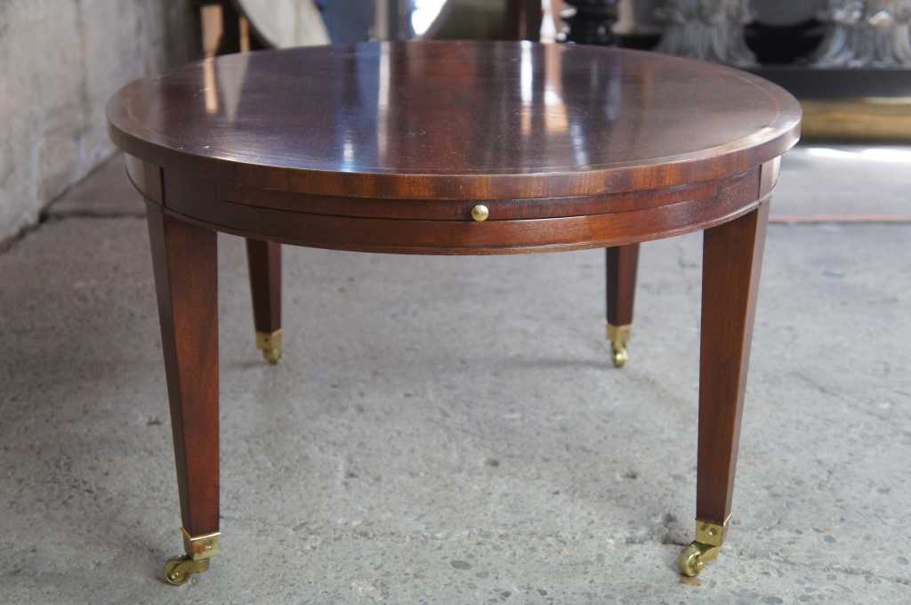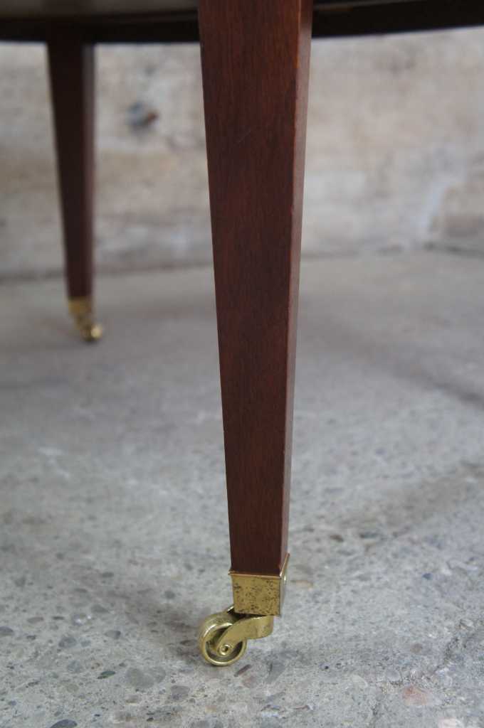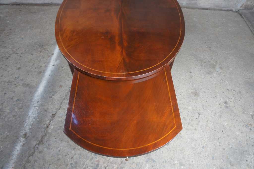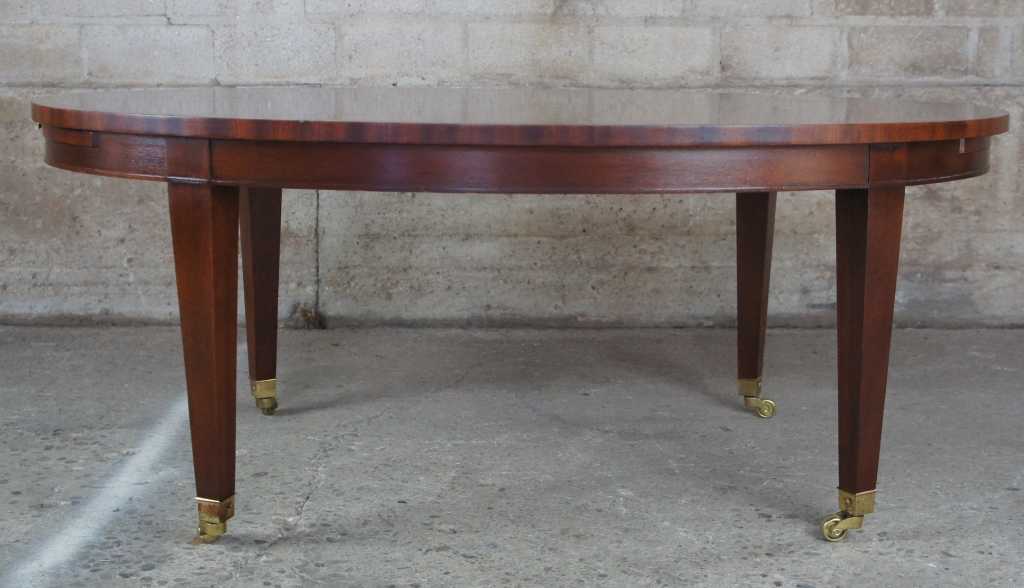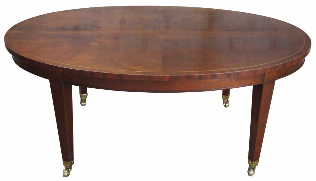 Baker Furniture Sheraton or Regency style coffee table. Oval shaped with flamed mahogany top, featuring inlaid band and large pull out leaves. The table is supported by tapered legs leading to brass caped castors.