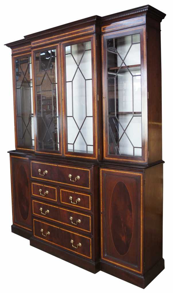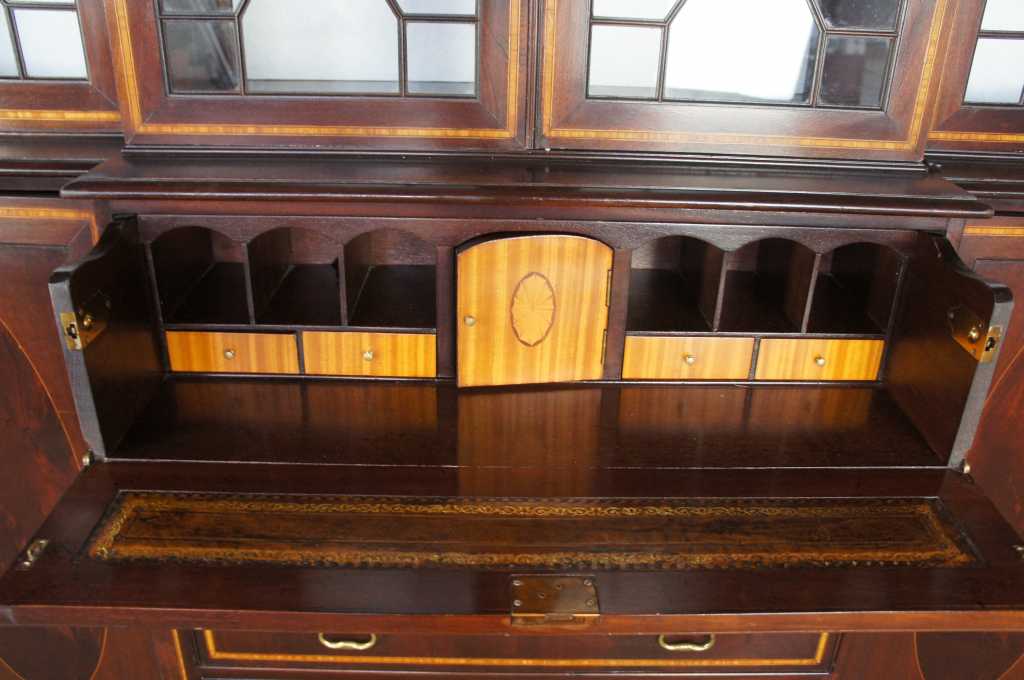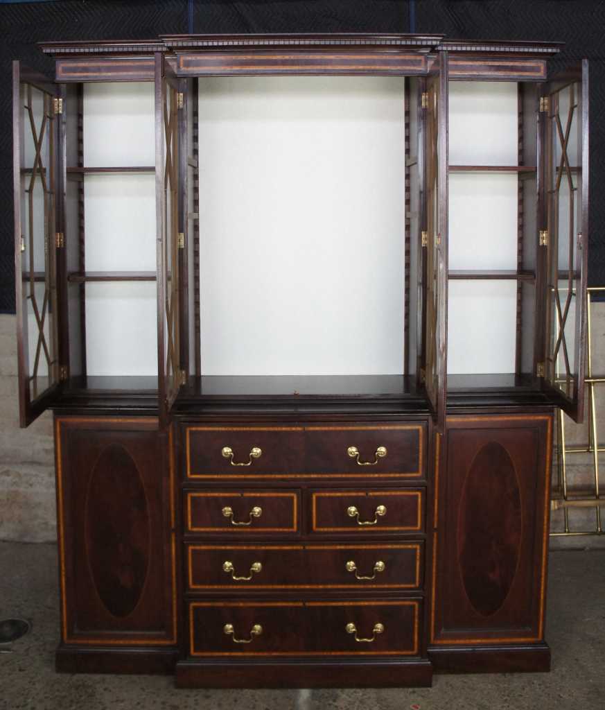 Custom made english breakfront. Made from mahogany with banding and walnut burled lower doors. The bookcase features fretwork over the glass doors with the interior lined/finished in French raised florish wallpaper. Lower portion of cabinet features a drop front leather secretary that opens to cubbies and drawers. Includes tooled leather writing surface, three additional drawers and outer cabinets with shelves, and functional locks with key.