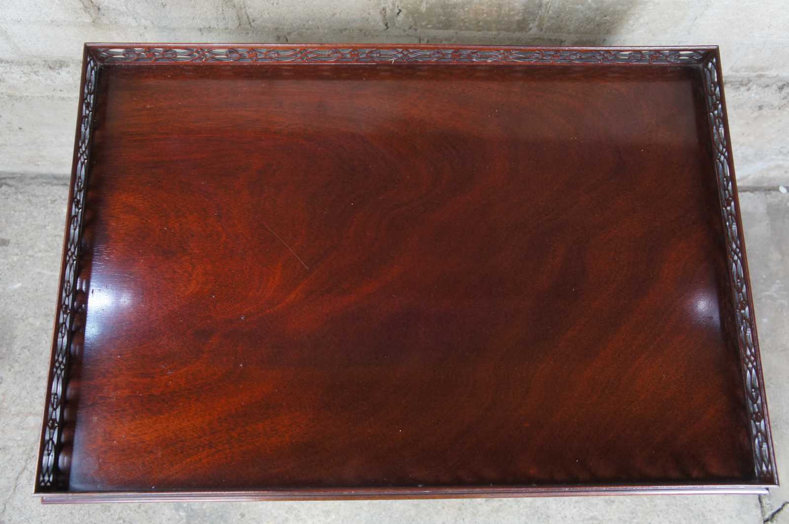 Kindel chippendale style carved mahogany table in Oxford finish. Features ornate fretwork and carvings.