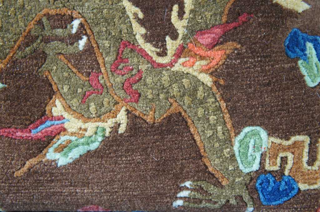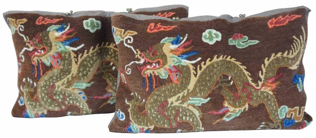 Chinese Dragon Pillows, featuring imperial dragons on fields of brown and blue, with cloud designs. Finished with brass hardware, pillow insert included. One pillow is marked Marshal and the other Threeline.