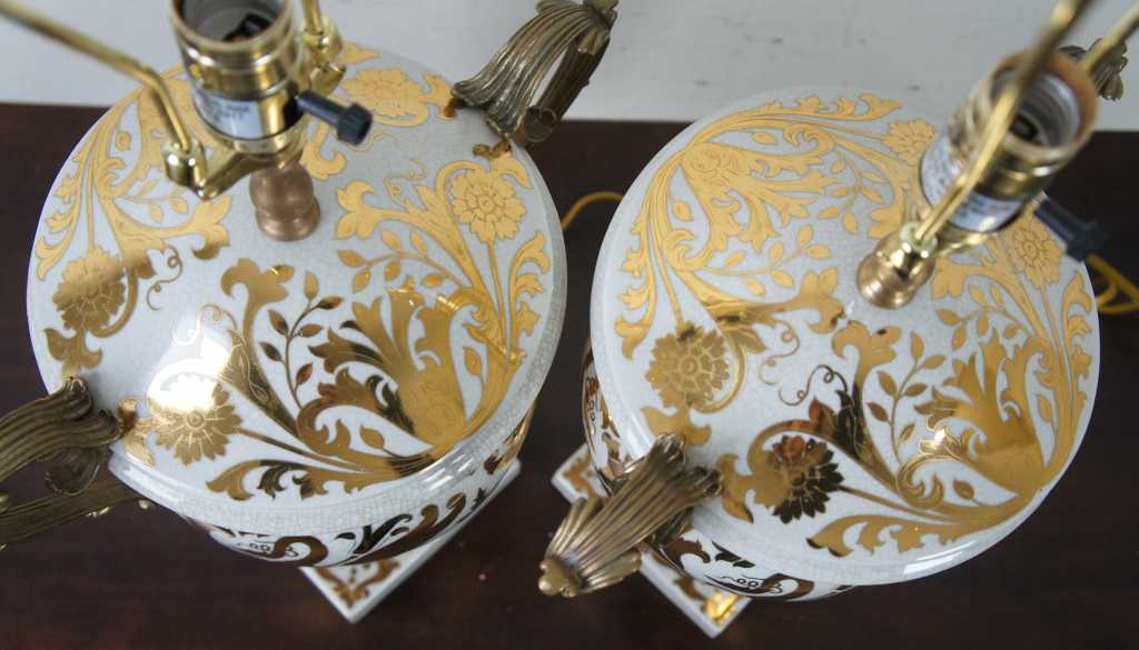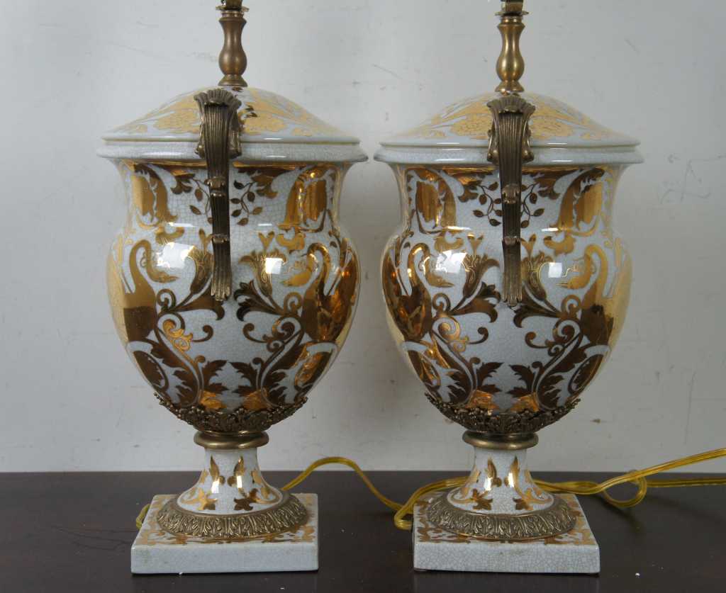 A very elegant and traditional urn shaped table lamp with antique brass handles and fittings. The Lillian August Collection. Item Model: Currey and Co 6410 Catalog Product Name: Currey and Co Tzarina Table Lamp Material: Porcelain/ Brass Finish / Color: Antique White And Gold Porcela Bulb Wattage: 100 Watt Total Fixture Wattage: 100 Watt Bulb Type: Edison