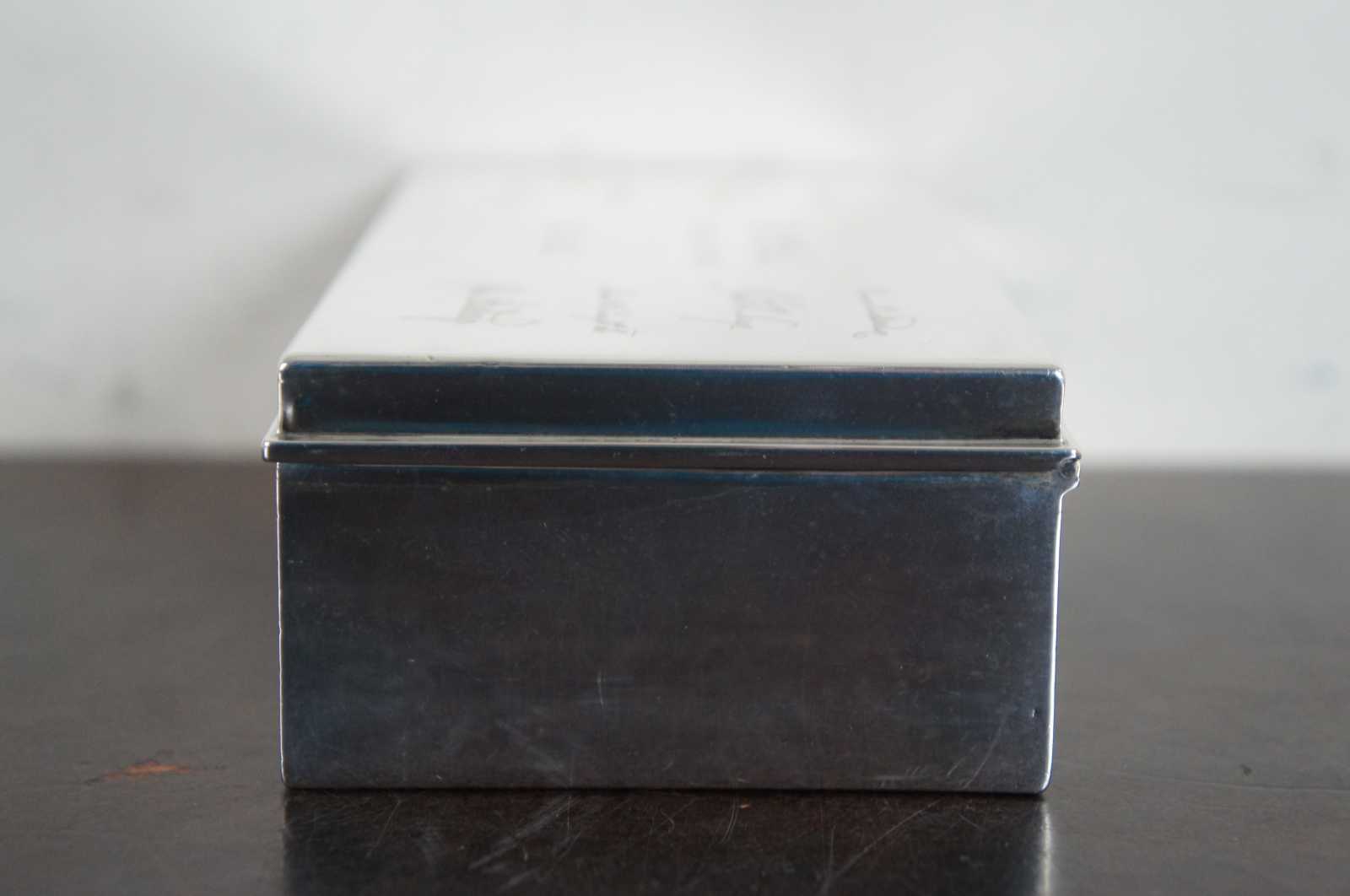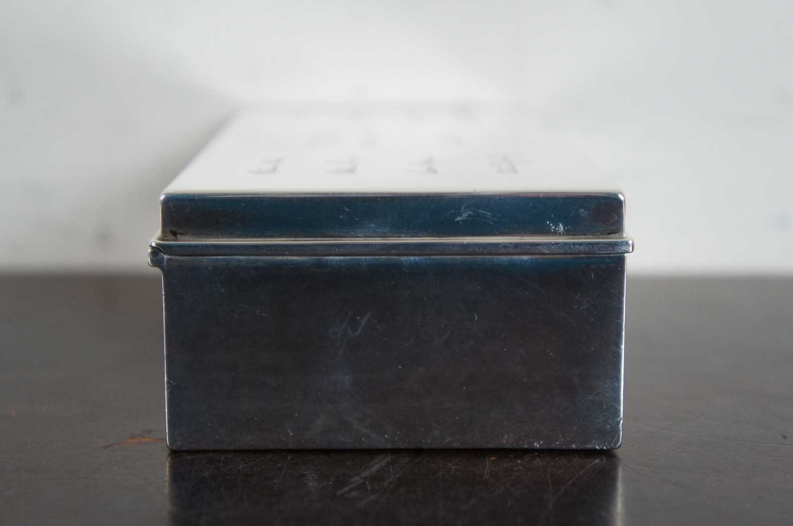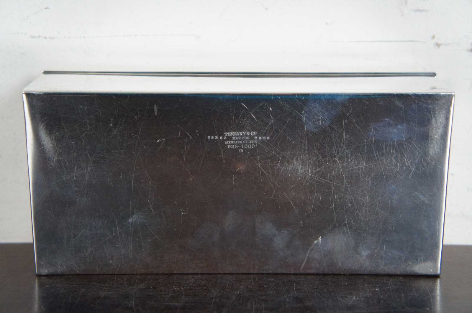 Antique sterling desk box by Tiffany. Described as a smart and modern sterling silver desk box. Made by Tiffany & Co. in New York, ca 1936. Rectangular with straight sides and sharp corners. Cover hinged with molded rim. Box interior cedar lined. Hallmark includes pattern no. 22353. Art deco era. Marked Tiffany & Co 22353 Makers 7938 Sterling Silver 925-1000 M