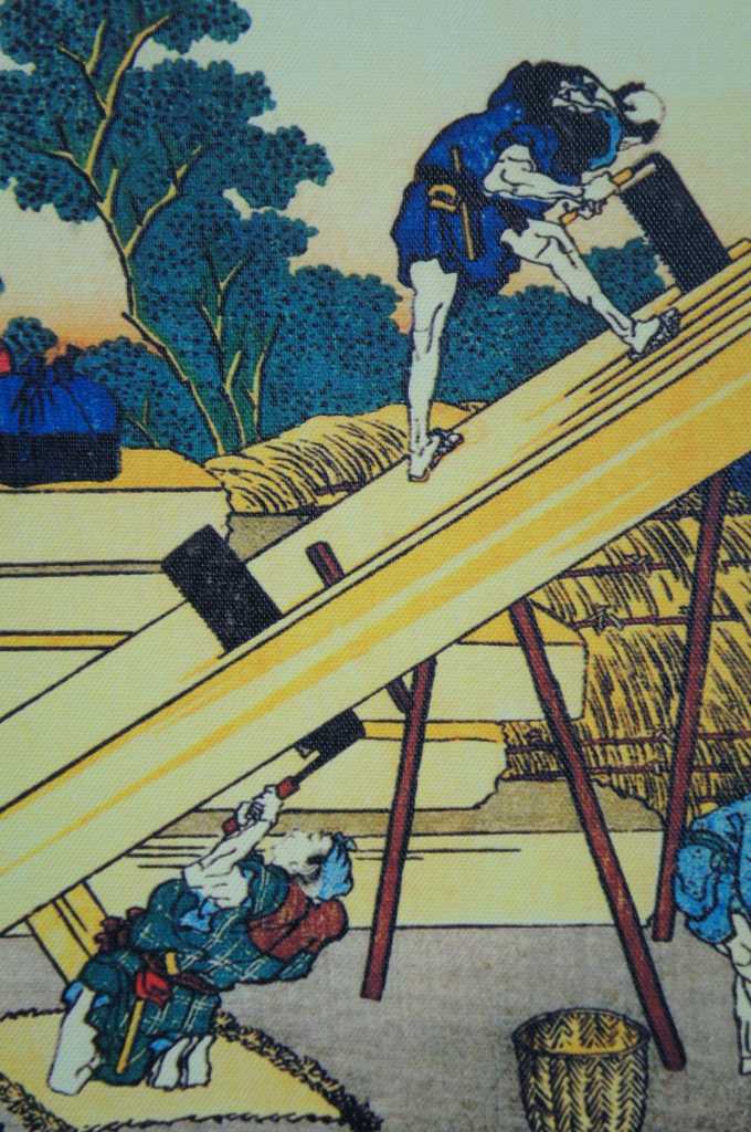 Colorful pair of Japanese style art prints on canvas. Made in USA. Features workers cutting and carrying supplies up mountainside. Mt Fuji can be seen in background.