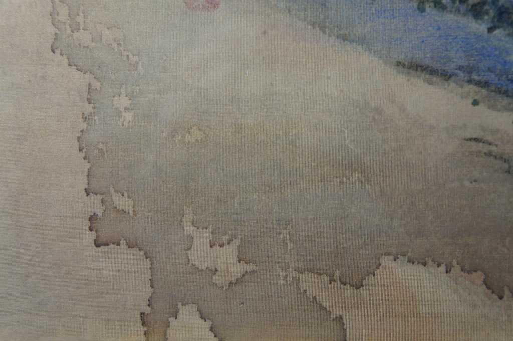 Gorgeous oriental hand painted landscape on silk. Depicts a mountainous setting with cherry blossom trees along the water with a pagoda in the distance.