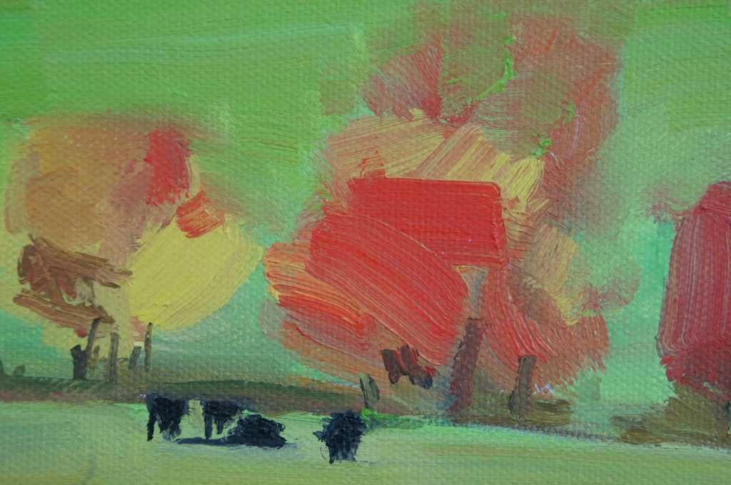 Impressionist painitng of cows in the countrysidex oil on canvas. Ann McLean has been painting since she moved to Quadra in 1978. Interested in all subject matter, she always returns to the landscape of Quadra which is her constant inspiration. Her lyric poetry is also influenced by nature and her political satire is commentary on island life and the current state of world affairs.