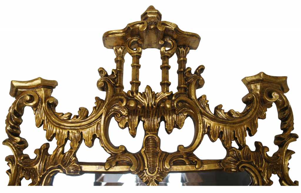English Chinese Chippendale style (20th century) gilt carved mirror with pagoda form pediment and open design framed border. Made from resin or composite with beveled mirror.
