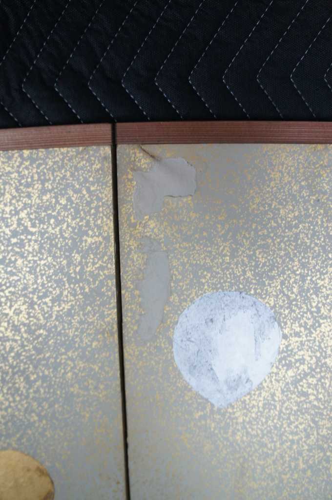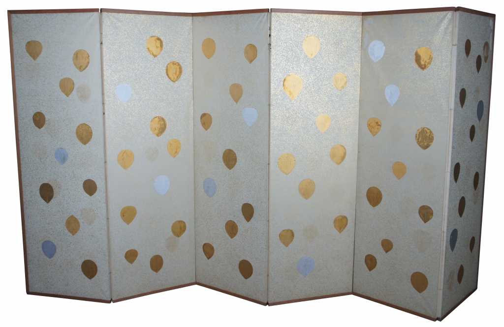 Hand decorated Japanese six panel folding screen. Gold foil backing with teardrop shaped gold and silver accents. Panels framed in wood. Along backing traditional Japanese writing can be seen along the rice paper.