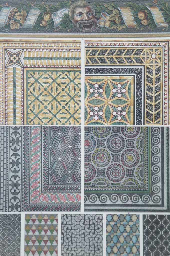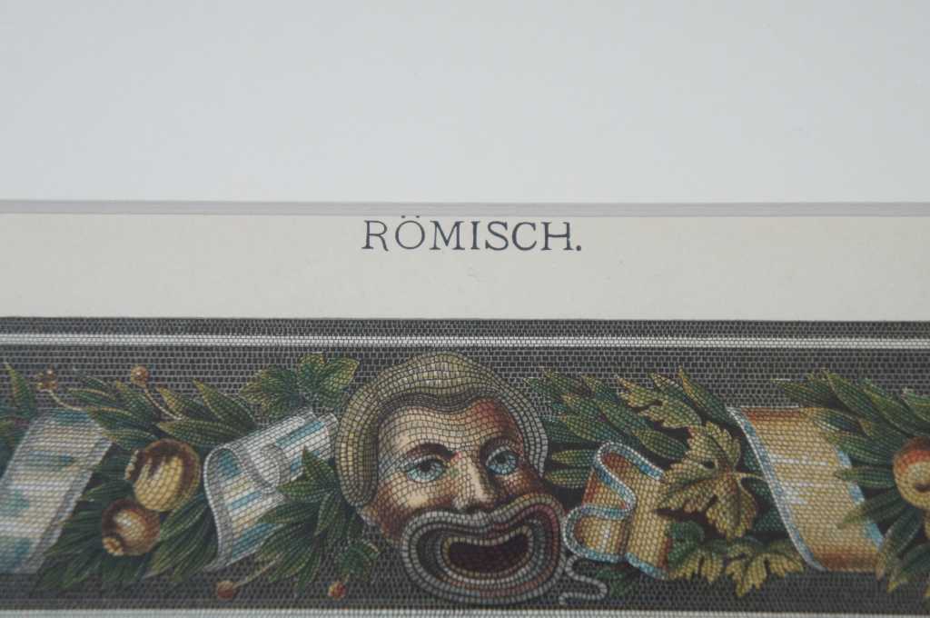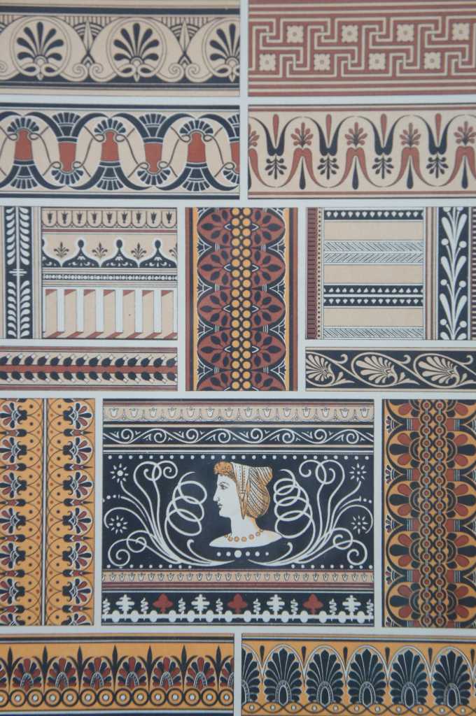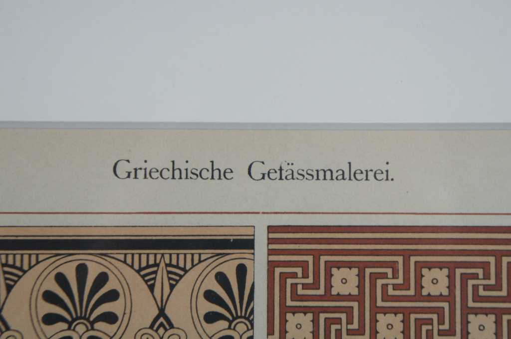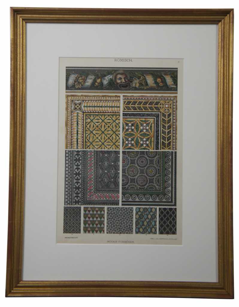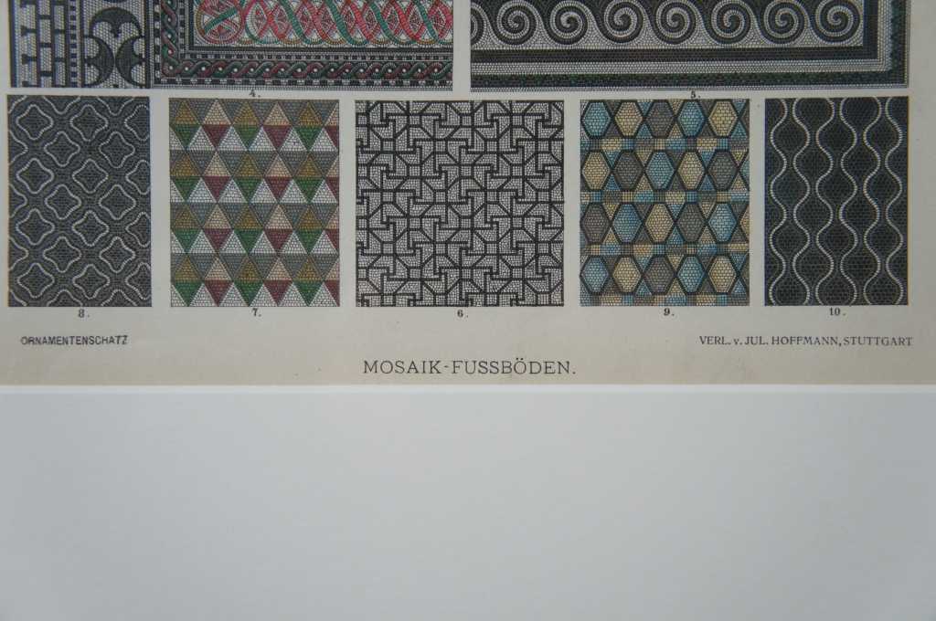 2 Emil Hochdanz architectural book plate prints. Feature mosic tiles, floor and ceiling embellishments/ornaments. One shows mosaic floors of Pompeii, Romisch (roman), Mosaik Fussboden; the other Griechische Gefassmalerei (greek), Mitgeteilt von L. King (communicated by the king). Stuttgart Hoffmann.