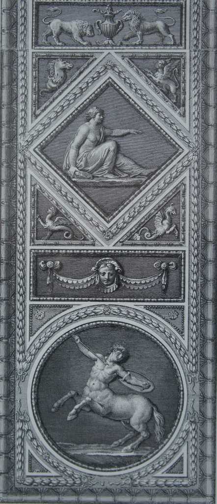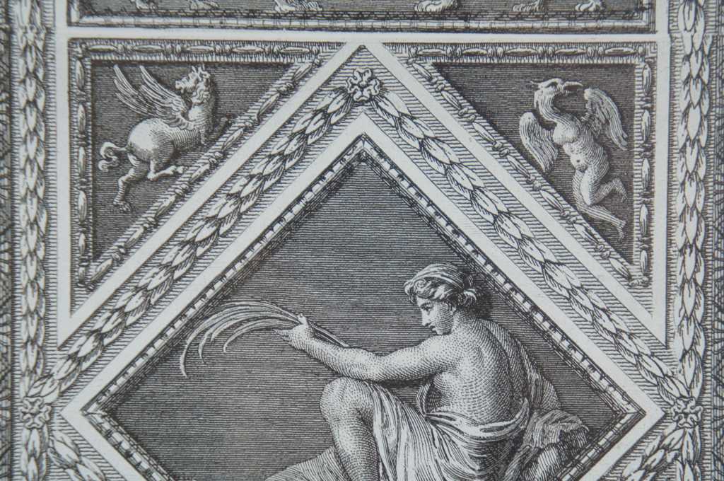 AN UNIDENTIFIED MASTER-ENGRAVER IN THE MID 18TH CENTURY CREATED THESE ROMANESQUE PANELS. ENGRAVERS OF THIS TIME WERE IN MOST CASES SUPPORTED BY RICH PATRONS WHO WOULD GIVE REPRODUCTIONS AS GIFTS TO THEIR BUSINESS ASSOCIATES AND FRIENDS. THE QUALITY OF THIS LINE DRAWING IS AMONG THE MOST BEAUTIFUL IN ALL FORMS OF ENGRAVING. NOTICEABLE BY THE MINUTE DETAILS AND LINEAR DEFINITION.
