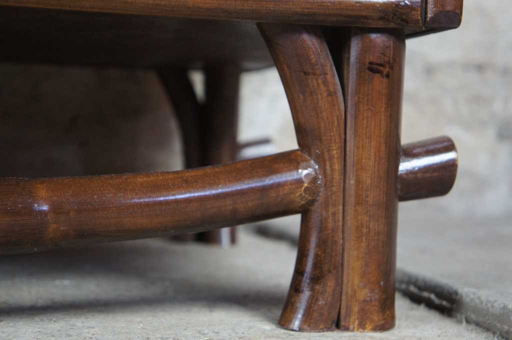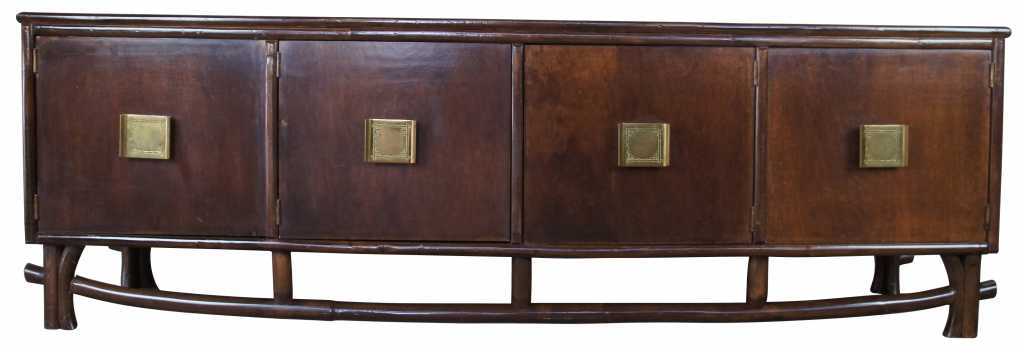 Mid 20th century asian inspired cabinet or console. Made from mahogany with black laminate top. Opens to four cubbies, features brass hardware with bamboo embossed motif.