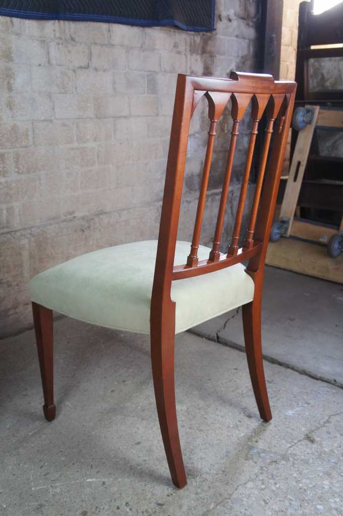 Baker Furniture Historic Charleston Collection Russell side chairs. Sheraton style with neoclassical inspired back. Made from mahogany with tapered legs leading to spade foot. Green velvet upholstered seats.