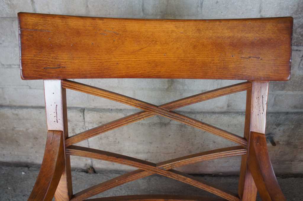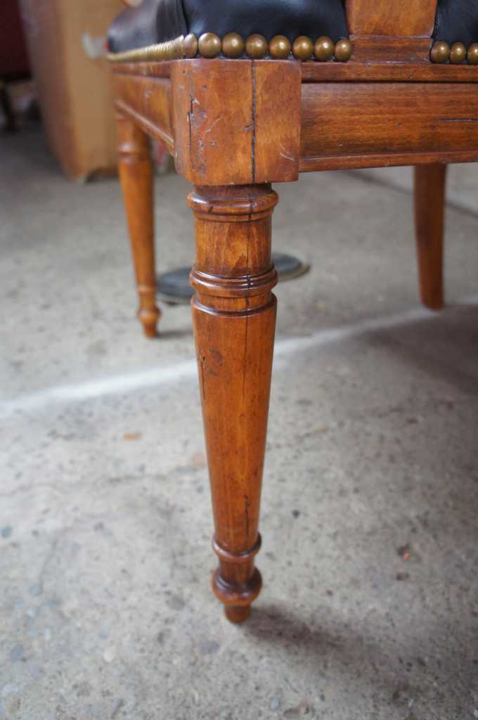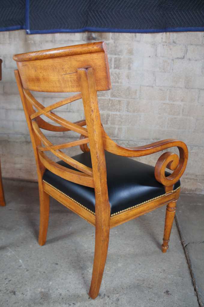 Milling Road for Baker (American, Grand Rapids, 1903-), late 20th century. Set of two Neoclassic walnut dining chairs, each having a curved crest scroll arm rail, an open double X-form fluted lattice back, with molded aprons, tapering tuned legs, and black leather and brass tack upholstery. Manufacturer's labels to underside. Product number MR3041.