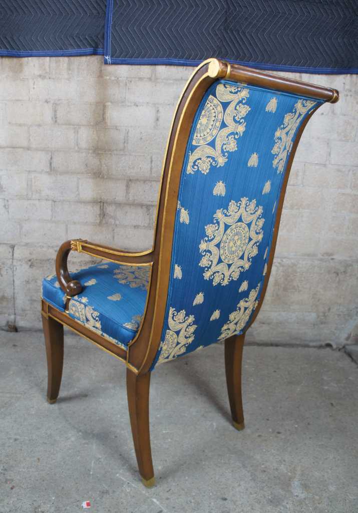 Karges French neoclassical regency style dining chairs with klismos leg. Features bronze ormolu, solid wood construction, nicely carved details, original label, shapely saber legs, sleek sculptural form, circa mid-20th century. Silk scalamandre upholstery with insects and gold medallions and flourishes.